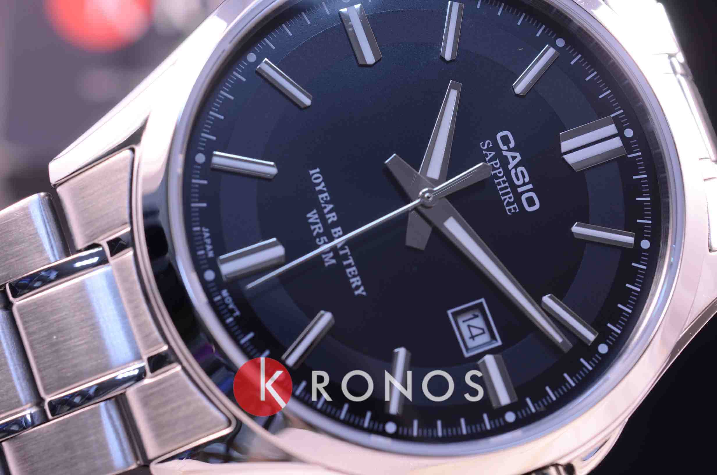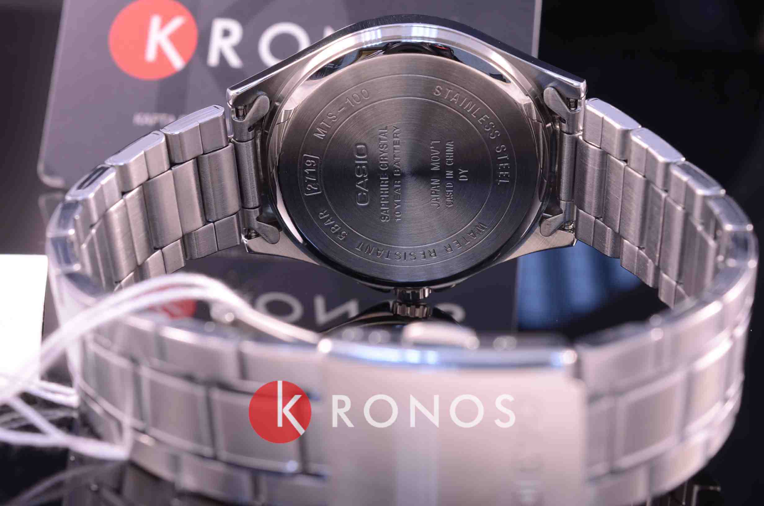 Японские мужские кварцевые часы с сапфировым стекломСапфировое стеклоПрочный и надёжный материал из кристалла сапфира синтетического происхождения, характеризующийся особой твёрдостью и устойчивостью к царапинам и повреждениям. Casio Collection MTS-100D-1A, кварцевый механизм с высокой точностью. Корпус и барслет часов изготовлены из нержавеющей. Подсветка NeobriteПодсветка NeobriteИспользование светонакопительных составов на основе сульфида цинка или алюмината стронция, яркий свет можно наблюдать на протяжении 6-10 часов после «зарядки» часов около источника света. обеспечивает длительное послесвечение в темноте даже после кратковременного нахождения на свету. Окошко даты находится в положении 3 часа. Батарея рассчитана на 10 лет. Заводная головка с защитой. Задняя крышка с винтовым фиксатором. Класс водозащиты: 50 метров, позволит защитить корпус от случайных брызг или капель дождя. Стальной браслет на раскладной застёжкеРаскладная застёжкаТакой тип застёжки используется только на браслетах из металла. Она никогда не раскрывается полностью, происходит разделение на 2 и более частей. Раскладывающая застёжка снизит вероятность потери часов к минимуму..