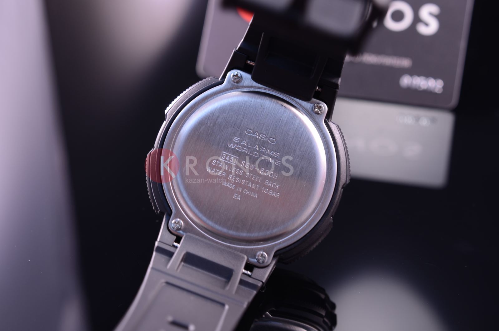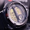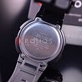 Прочный круглый корпус выполнен из пластика и алюминия. Тип механизма - электронный. Есть сплит-хронограф. В часы встроены 5 ежедневных будильников. Электролюминесцентная подсветка обеспечивает видимость данных в темноте. Вставлен алюминиевый безельБезельВнешний ободок, закрепляющий стекло. В спортивных часах так называется поворотное кольцо с делениями на циферблате, выполняет роль таймера – замеряет отрезки времени на шкале. Неподвижный безель – элемент декора. Однонаправленно вращающийся безель на дайверских часах позволяет фиксировать моменты погружения и выныривания на поверхность.. Водонепроницаемость составляет 100 WR.