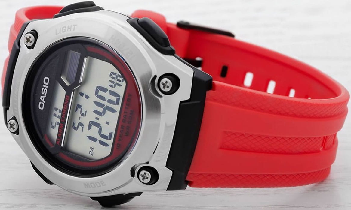 Спортивные мужские наручные часы. Автоматический календарь. 12и 24-часовой формат времени. Секундомер. Отображение времени в двух часовых поясах. Корпус - Пластиковый; Стекло - Пластик; Водозащита - 50 м. (WR 50); Материал ремешка - Пластиковый; Цвет ремешка - Красный; Цвет циферблата - Lcd.