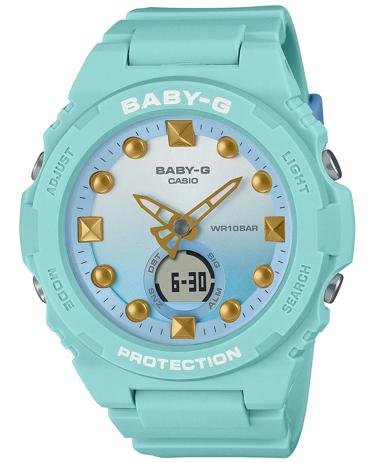 Женские противоударные японские наручные часы Casio Baby-G BGA-320-3A, кварцевый механизм с высокой точностью. Класс водозащиты: 100 метров, позволит плавать, нырять и заниматься другими водными видами спорта. Корпус часов изготовлен из пластика. Ударопрочный корпусУдаропрочный корпусМеханизм заключён в корпус, выполненный из современных материалов, устойчивых к ударам, механическим повреждениям и падению с высоты: инновационный пластик, карбон, нержавеющая сталь, титан. защищает механизм от ударов и вибрации. Пластиковый ремешок на стандартной застёжке. Японский кварцевый механизм работает от аккумулятора, рассчитанного на 3 года работы. Минеральное стеклоМинеральное стеклоМинеральное стекло представляет собой искусственно выращенный минерал кварца. Такое стекло отличается особой устойчивостью к повреждениям и царапинам. Уступает по некоторым качествам сапфировому стеклу. устойчивое к мелким механическим повреждениям. Светодиодная подсветкаСветодиодная подсветкаСветодиодная или LED-подсветка обеспечивает появление яркого холодного свечения за счёт LED-элементов - маленьких лампочек. Они потребляют минимальное количество энергии, чаще всего можно встретить 1 светодиод, в нижней части циферблата. освещает весь циферблат, после отпускания кнопки свечение продолжается еще некоторое время. Функция секундомераСекундомерСекундоме́р — прибор, способный измерять интервалы времени с точностью до долей секунды. с точностью измерения 1/100 секунды и измерением до 23 часов 59 минут 59,99 cек. ТаймерТаймерОтсчитывает секунды в обратном направлении в заданном интервале времени. обратного отсчета (диапазон времени 24 часа). 5 ежедневных будильниковБудильникБуди́льник — часы, в заданный момент времени подающие звуковой, световой и/или в редких случаях другой сигнал.. Автоматический календарь. Функция мирового времениМировое время Полезное часовое усложнение, отображающее время в основных городах и известных областях по всему миру, оно связано с часовыми поясами, удобно для путешественников и бизнесменов. 30 городов (29 часовых поясов).