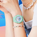Причудливые детали и игривый дизайн в корпусе цвета морской лагуны обязательно скрасят ваш день. Цветовая градация на циферблате напоминает о меняющемся летнем пляжном пейзаже с заходом солнца. Указательные метки, обработанные методом напыления из паровой фазы металла, сияют, как жемчужины и морские раковины океанских сокровищ, а минутная стрелка напоминает хвост русалки. Добавьте пляжный стиль в свой гардероб и начинайте лето с чистого листа.