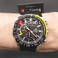 Модель отличается динамичным дизайном с уклоном в автомобильную стилистику, поклонники спортивного стиля по достоинству оценят аксессуар. Односторонне вращающийся безельБезельВнешний ободок, закрепляющий стекло. В спортивных часах так называется поворотное кольцо с делениями на циферблате, выполняет роль таймера – замеряет отрезки времени на шкале. Неподвижный безель – элемент декора. Однонаправленно вращающийся безель на дайверских часах позволяет фиксировать моменты погружения и выныривания на поверхность. имеет цветное IP-покрытиеIP-покрытиеМетод ионного напыления. Демонстрирует повышенную устойчивость к истиранию, окислению и химическим веществам. Под воздействием высокого давления и температуры около 1500°C молекулы металла надёжно соединяются с частицами корпуса часов., дополнительно защищающее от царапин. Кварцевый механизм с точностью хода +/- 20 секунд в месяц. Срок службы батарейки - 3 года. Заводная головка с защитой. Закручивающаяся задняя крышка. Водонепроницаемость 100 метров. Противоударный корпусУдаропрочный корпусМеханизм заключён в корпус, выполненный из современных материалов, устойчивых к ударам, механическим повреждениям и падению с высоты: инновационный пластик, карбон, нержавеющая сталь, титан. из нержавеющей стали 316L. Полимерный ремешок. Минеральное стекло, устойчивое к царапинам. Подсветка NeobriteПодсветка NeobriteИспользование светонакопительных составов на основе сульфида цинка или алюмината стронция, яркий свет можно наблюдать на протяжении 6-10 часов после «зарядки» часов около источника света.. Секундомер, хронографХронографФункция позволяет измерять отрезки времени с особой точностью: часы, минуты, секунды. Верным признаком хронографа является наличие на циферблате 3 дополнительных окошек-счётчиков., индикация числа. Габариты: 49,3 x 43,2 x 11,7 мм.