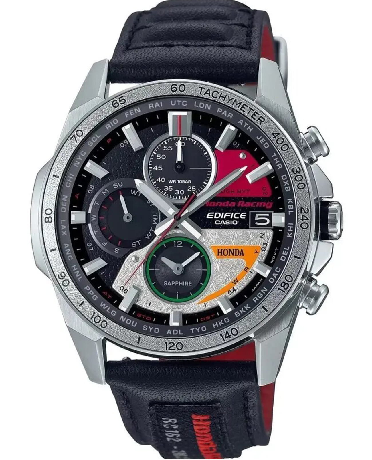 Стильный динамичный дизайн этих часов оценит по достоинству любой поклонник спортивного стиля. Edifice Honda Racing Limited Edition. Лимитированная серия. Часы созданы при сотрудничестве с компанией Honda Racing и посвящены 60-летию победы японского гонщика Kunimitsu Takahashi (Кунимицу Такахаси) в Гран-при Германии. Кунимицу стал первым японцем-победителем мотоциклетного Гран-при. Аббревиатура RC162 на ремешке означает модель байка, на котором гонщик выиграл 10 гонок Гран-при в течении года. Цветовая гамма часов выполнена в стиле байка Honda RC162. Питание от солнечной энергии Tough Solar - солнечные батарейки большой мощности, индикатор заряда батареи.