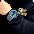 Мужские кварцевые часы Casio GA-110AS-2A — это лимитированная модель из коллекции G-Shock, сочетающая в себе устойчивость к внешним воздействиям и стильный дизайн. Модель выполнена из биопластика, который производится из возобновляемых органических ресурсов, что делает её экологичной и прочной. Циферблат вдохновлён морскими волнами, а его поверхность защищена минеральным стекломМинеральное стеклоМинеральное стекло представляет собой искусственно выращенный минерал кварца. Такое стекло отличается особой устойчивостью к повреждениям и царапинам. Уступает по некоторым качествам сапфировому стеклу., устойчивым к повреждениям. Корпус и ремешок из полимерного пластика оснащены функцией ударопрочности, которая защищает механизм от ударов и вибраций. Часы также устойчивы к магнитным полям. Функциональность модели включает таймер обратного отсчёта, хронограф, секундомер с точностью 1/100 секунды, будильник, мировое время (48 городов, 31 часовой пояс), вечный календарь до 2099 года, сигнал начала часа, функцию летнего времени (DST) и функцию выключения звука нажатия кнопок (Mute). Подсветка выполнена по технологии светодиодной подсветкиСветодиодная подсветкаСветодиодная или LED-подсветка обеспечивает появление яркого холодного свечения за счёт LED-элементов - маленьких лампочек. Они потребляют минимальное количество энергии, чаще всего можно встретить 1 светодиод, в нижней части циферблата., которая автоматически включается при повороте часов к лицу. Цвет подсветки — оранжевый, а послесвечение длится 1,5 или 3 секунды. Стрелки и цифры имеют необритовое покрытиеПодсветка NeobriteИспользование светонакопительных составов на основе сульфида цинка или алюмината стронция, яркий свет можно наблюдать на протяжении 6-10 часов после «зарядки» часов около источника света., обеспечивающее длительное послесвечение даже после кратковременного нахождения на свету. Часы водонепроницаемы до 200 метров (, что позволяет использовать их при плавании и других водных активностях без глубокого погружения. Гарантия 12 месяцев подтверждает качество и долговечность изделия. Эти часы станут универсальным аксессуаром для тех, кто ценит сочетание стиля, функциональности и надёжности — идеальный выбор для повседневной носки и активного образа жизни.