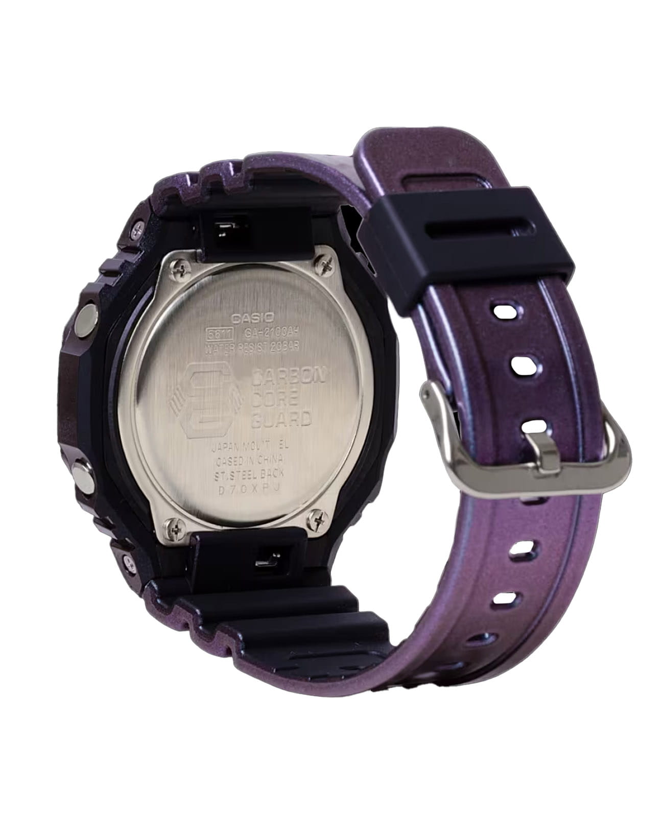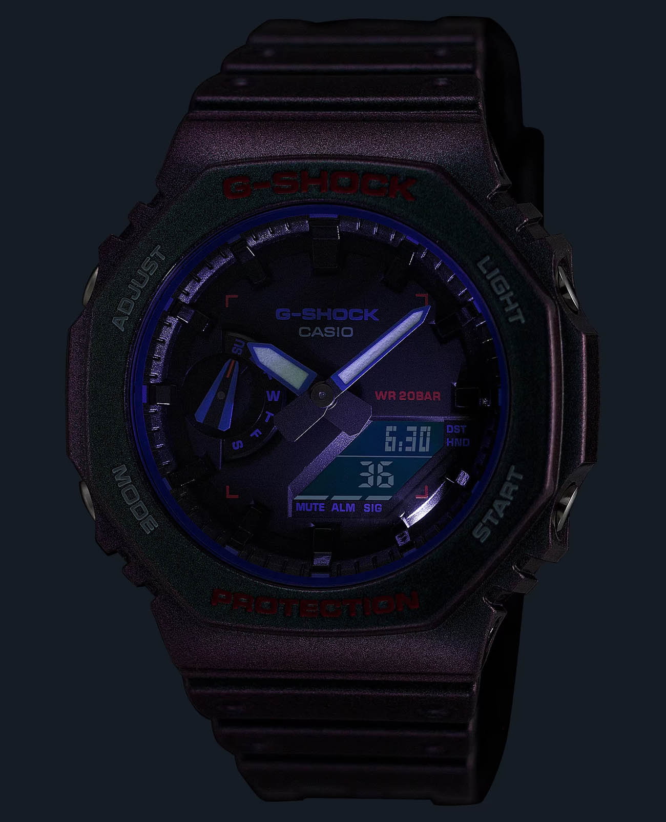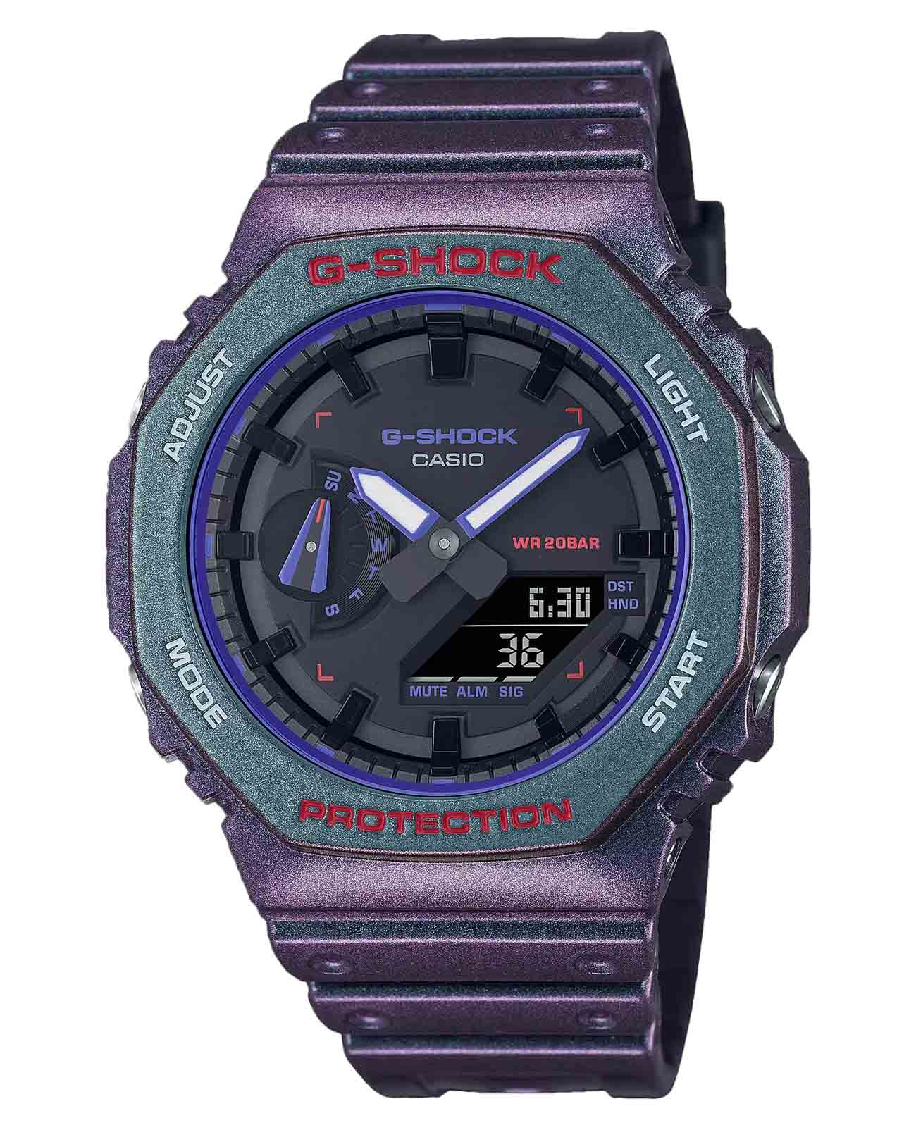 Японские мужские часы Casio G-Shock GA-2100AH-6A. Для тех, кто ставит перед собой более высокие цели в виртуальном мире — и в реальной жизни! Представляем G-SHOCK, вдохновленный решимостью, необходимой для достижения высочайших уровней компьютерных игр и выживания. Геймеры знают, что нужно для достижения высоких результатов в экшенах и стрелялках. Эти часы воссоздают захватывающий, постоянно меняющийся игровой мир с помощью поляризованной краски фиолетового и зеленого цветов, которая меняет цвет в зависимости от угла обзора. Такие детали, как оптический прицел для наведения прицела на цель, воплощены в оранжевых акцентах и графике на жидкокристаллическом экране, создавая игривый дизайн, который плавно перемещается между реальным и виртуальным мирами. Carbon Core GuardCarbon Core Guard Новейшая структура корпуса, разработанная Casio. Полиуретановая пластина дополнительно усилена карбоновыми вставками, что придаёт специальную защиту от механических повреждений. Карбон отличается лёгкостью и прочностью.. Минеральное стеклоМинеральное стеклоМинеральное стекло представляет собой искусственно выращенный минерал кварца. Такое стекло отличается особой устойчивостью к повреждениям и царапинам. Уступает по некоторым качествам сапфировому стеклу. устойчивое к появлению царапин, обладающее высокой прозрачностью. Светодиодная подсветкаСветодиодная подсветкаСветодиодная или LED-подсветка обеспечивает появление яркого холодного свечения за счёт LED-элементов - маленьких лампочек. Они потребляют минимальное количество энергии, чаще всего можно встретить 1 светодиод, в нижней части циферблата., настраиваемое послесвечение 1,5 или 3сек. Мировое время Мировое время Полезное часовое усложнение, отображающее время в основных городах и известных областях по всему миру, оно связано с часовыми поясами, удобно для путешественников и бизнесменов. 31 часовой пояс (48 городов + всемирное координированное время UTCUTCВсемирное кординационное время, не имеющее привязки к географическому положению Гринвича, основывается на атомном отсчёте времени. Регулировка времени осуществляется более точно, чем устаревшее GMT.