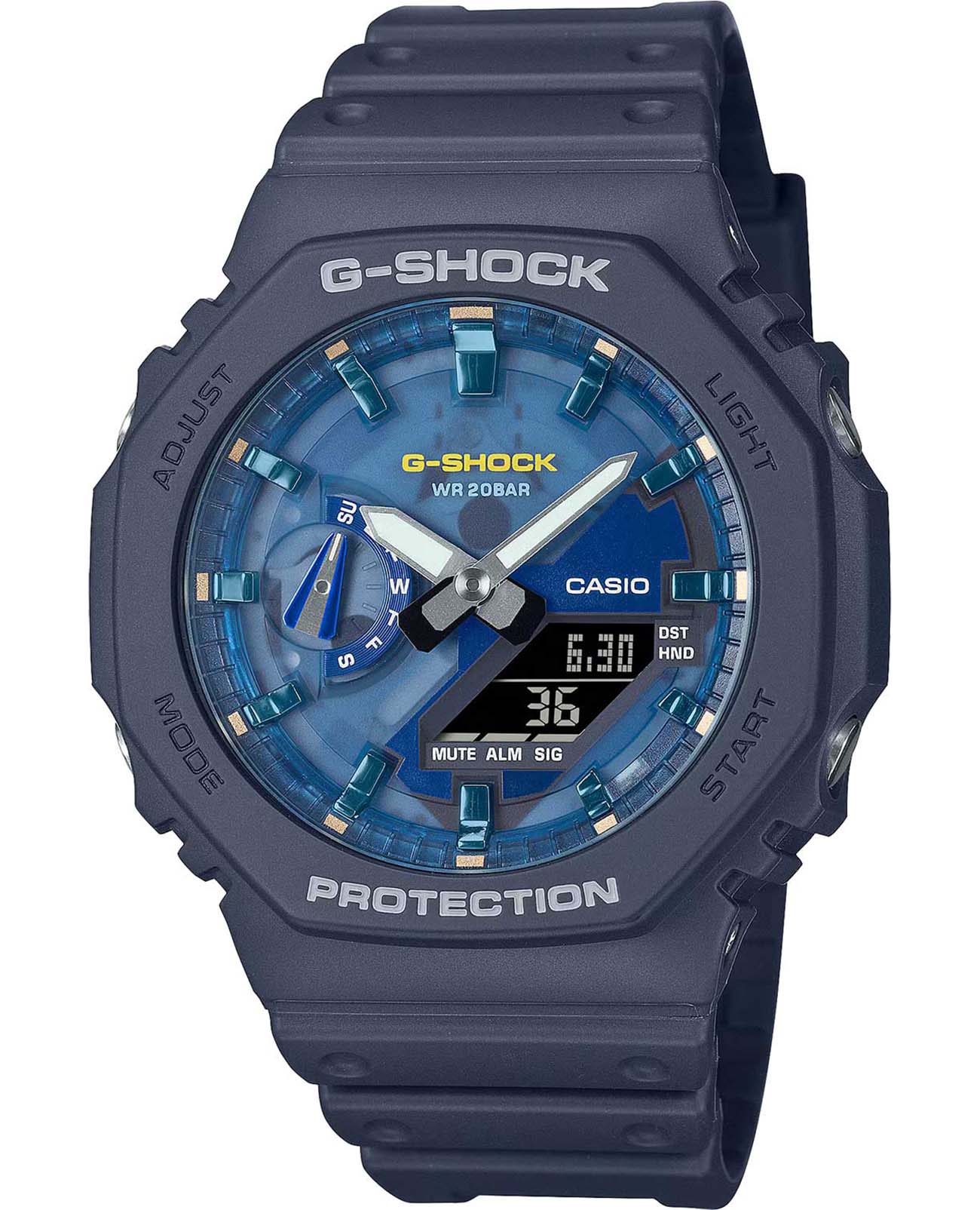Мужские кварцевые часы Casio GA-2100AS-2A — это современные и экологичные часы из серии G-Shock с уникальным дизайном, вдохновлённым морскими волнами. Корпус и браслет выполнены из биопластика, изготовленного из возобновляемых органических ресурсов, что делает модель более экологичной. Конструкция включает Carbon Core GuardCarbon Core Guard Новейшая структура корпуса, разработанная Casio. Полиуретановая пластина дополнительно усилена карбоновыми вставками, что придаёт специальную защиту от механических повреждений. Карбон отличается лёгкостью и прочностью. — технологию, при которой карбоновые волокна усиливают корпус, делая его одновременно более прочным и лёгким, а также защищая внутренний модуль от повреждений и деформаций при ударах. Часы оснащены Ударопрочный корпусУдаропрочный корпусМеханизм заключён в корпус, выполненный из современных материалов, устойчивых к ударам, механическим повреждениям и падению с высоты: инновационный пластик, карбон, нержавеющая сталь, титан., обеспечивающим надёжную защиту механизма в любых условиях. Лицевая часть защищена минеральным стекломМинеральное стеклоМинеральное стекло представляет собой искусственно выращенный минерал кварца. Такое стекло отличается особой устойчивостью к повреждениям и царапинам. Уступает по некоторым качествам сапфировому стеклу.. Стальная задняя крышка закреплена на 4 винтах для дополнительной прочности. Циферблат синего цвета дополнен цифровыми дисплеями и ретроградным указателем дня недели. На стрелках и метках нанесено необритовое покрытиеПодсветка NeobriteИспользование светонакопительных составов на основе сульфида цинка или алюмината стронция, яркий свет можно наблюдать на протяжении 6-10 часов после «зарядки» часов около источника света., обеспечивающее длительное свечение в темноте после кратковременного нахождения на свету. Двойная подсветка включает светодиодную подсветкуСветодиодная подсветкаСветодиодная или LED-подсветка обеспечивает появление яркого холодного свечения за счёт LED-элементов - маленьких лампочек. Они потребляют минимальное количество энергии, чаще всего можно встретить 1 светодиод, в нижней части циферблата. циферблата и ЖК-дисплеев: после нажатия кнопки освещение горит дополнительно 1,5 или 3 секунды — время задержки настраивается. Цвет подсветки — белый. Функциональность включает хронографХронографФункция позволяет измерять отрезки времени с особой точностью: часы, минуты, секунды. Верным признаком хронографа является наличие на циферблате 3 дополнительных окошек-счётчиков. с точностью 1/100 секунды (до 1 часа) и 1 секунда (после 1 часа), максимальное время измерения — 24 часа, а также реализован Сплит-хронографСплит-хронографИспользуется для измерения продолжительности нескольких временных отрезков, начинающихся одновременно, а заканчивающихся в разное время. для фиксации промежуточных результатов. Встроенный таймер обратного отсчётаТаймерОтсчитывает секунды в обратном направлении в заданном интервале времени. позволяет выставлять интервалы от 1 секунды до 24 часов. Часы поддерживают мировое времяМировое время Полезное часовое усложнение, отображающее время в основных городах и известных областях по всему миру, оно связано с часовыми поясами, удобно для путешественников и бизнесменов. — 48 городов (31 часовой пояс) и UTCUTCВсемир
