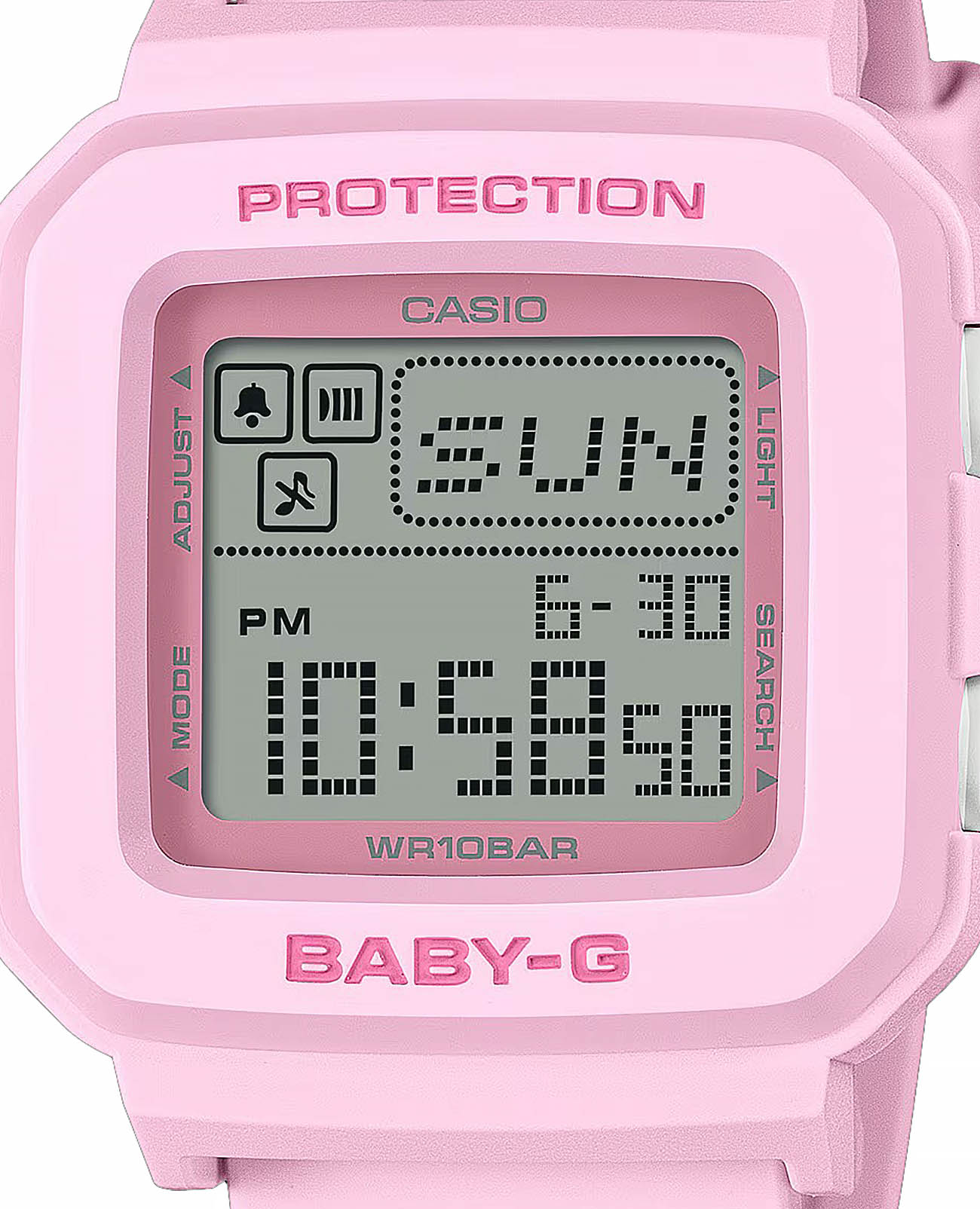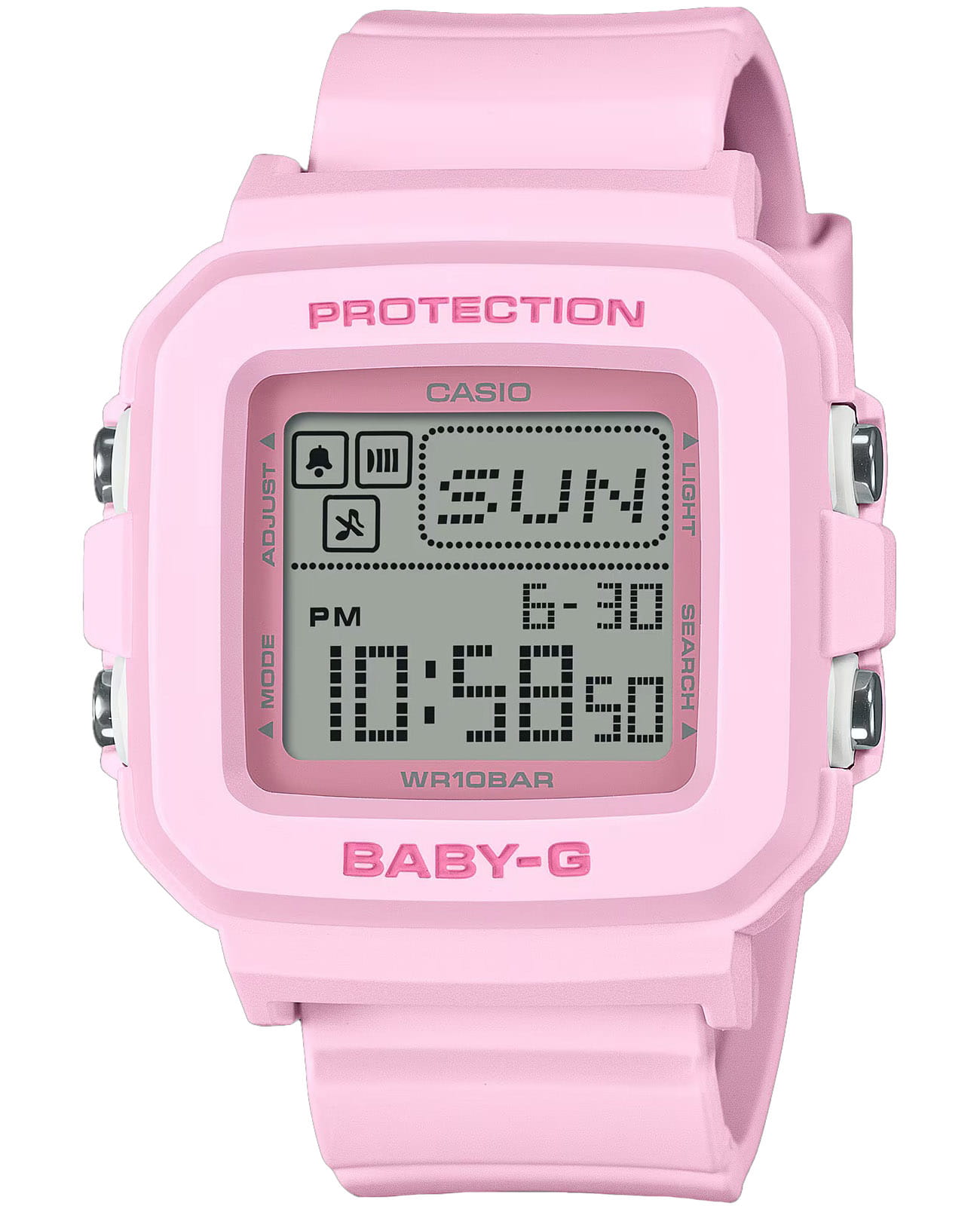 Современные надежные японские наручные женские часы Casio Baby-G BGD-10-4DR (BGD-10-4). Ударопрочный корпусУдаропрочный корпусМеханизм заключён в корпус, выполненный из современных материалов, устойчивых к ударам, механическим повреждениям и падению с высоты: инновационный пластик, карбон, нержавеющая сталь, титан. изготовлен из пластика. Минеральное стеклоМинеральное стеклоМинеральное стекло представляет собой искусственно выращенный минерал кварца. Такое стекло отличается особой устойчивостью к повреждениям и царапинам. Уступает по некоторым качествам сапфировому стеклу. устойчивое к появлению царапин, обладающее высокой прозрачностью. Водозащита: 100 метров, позволит плавать, нырять и заниматься другими водными видами спорта. БудильникБудильникБуди́льник — часы, в заданный момент времени подающие звуковой, световой и/или в редких случаях другой сигнал., таймерТаймерОтсчитывает секунды в обратном направлении в заданном интервале времени. и секундомерСекундомерСекундоме́р — прибор, способный измерять интервалы времени с точностью до долей секунды.. Срок жизни батареи 3 года. Пластиковый ремешок.