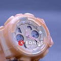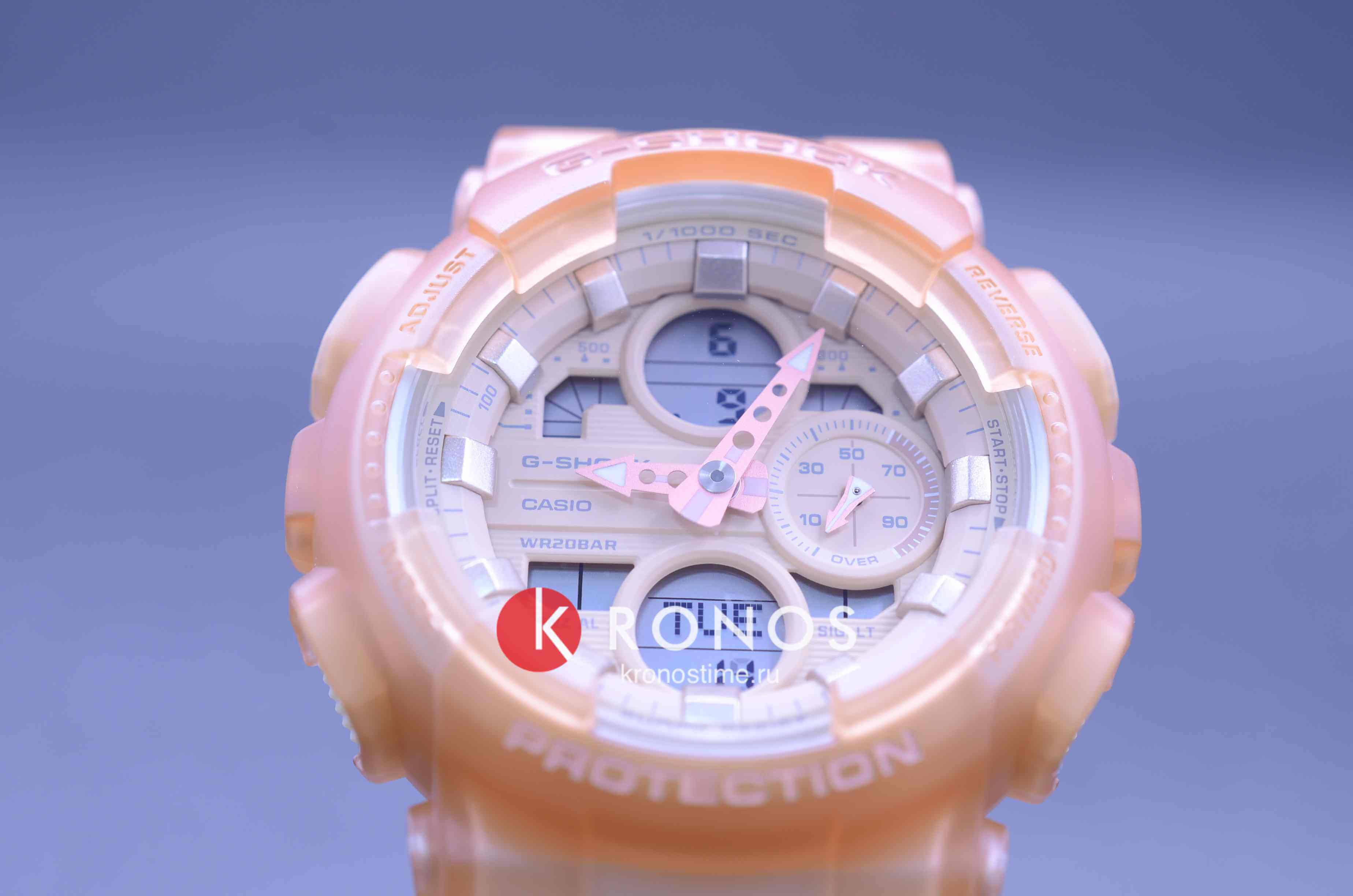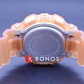 Компактный аксессуар имеет дизайн в скелетонизорованном формате. Полимерный корпус и ремешок светло-оранжевого оттенка изготовлены в полупрозрачном исполнении. Циферблат с минеральным стеклом наделён винтажными элементами: окошки и стрелки оформлены в духе музыкальных проигрывателей эпохи 90-х. Модель обладает противоударным корпусомУдаропрочный корпусМеханизм заключён в корпус, выполненный из современных материалов, устойчивых к ударам, механическим повреждениям и падению с высоты: инновационный пластик, карбон, нержавеющая сталь, титан., выдерживающим удары, вибрации, падение с высоты. Наручные часы станут идеальным вариантом для девушки, придерживающейся активного образа жизни. Японский кварцевый калибр характеризуется точностью хода +/- 15 секунд в месяц. Он работает от батарейки с 2-летним сроком службы. Часы подходят для плавания и ныряния, так как сохраняют водонепроницаемость при давлении до 20 бар. Циферблат подсвечивается LED-диодом Светодиодная подсветкаСветодиодная или LED-подсветка обеспечивает появление яркого холодного свечения за счёт LED-элементов - маленьких лампочек. Они потребляют минимальное количество энергии, чаще всего можно встретить 1 светодиод, в нижней части циферблата., функция автоподсветки активируется при поднесении часов к лицу. Функции: секундомер с точностью в 1/1000 секунды, хронографХронографФункция позволяет измерять отрезки времени с особой точностью: часы, минуты, секунды. Верным признаком хронографа является наличие на циферблате 3 дополнительных окошек-счётчиков., будильник, мировое времяМировое время Полезное часовое усложнение, отображающее время в основных городах и известных областях по всему миру, оно связано с часовыми поясами, удобно для путешественников и бизнесменов. – 48 городов, календарь, таймер, индикация средней скорости пройденного маршрута. Габариты: 49 x 45,9 x 15,8 мм.