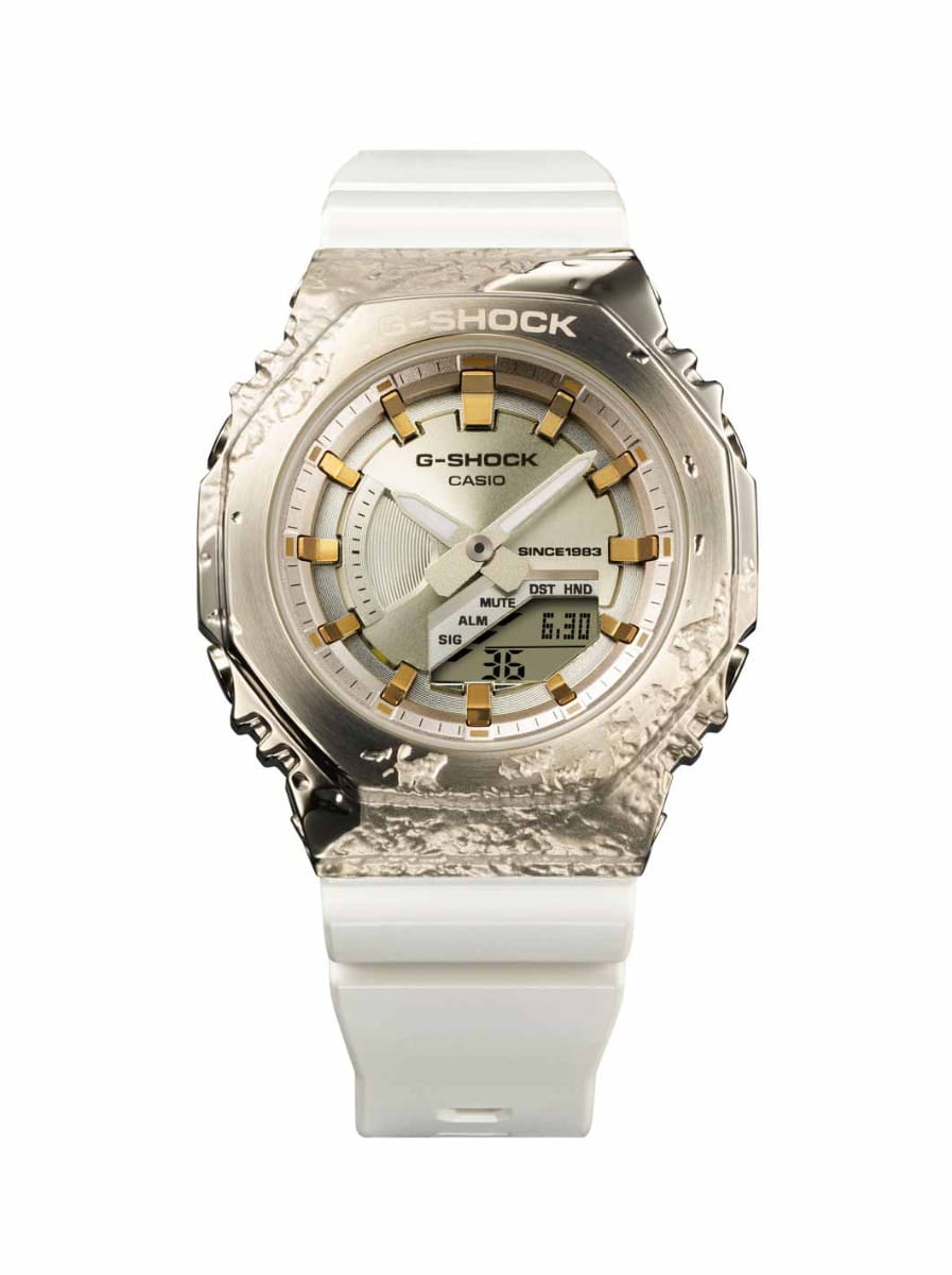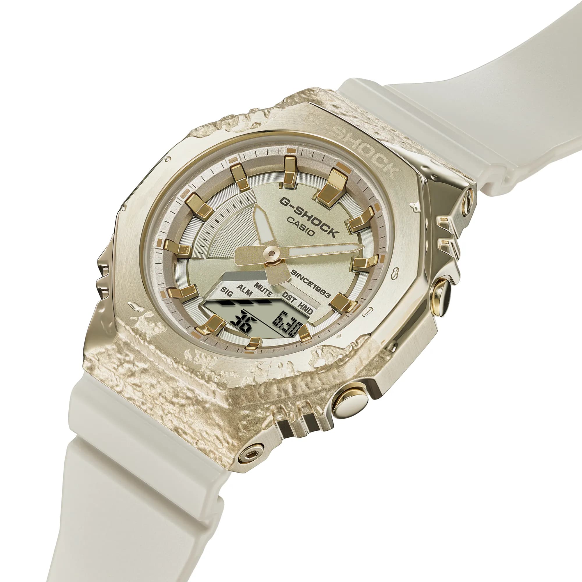 Японские унисекс часы с двойной подсветкой Casio G-Shock GM-S2140GEM-9A, кварцевый механизм с высокой точностью. Класс водозащиты: 200 метров, позволит плавать, нырять и заниматься другими водными видами спорта. Корпус часов изготовлен из пластика. Ударопрочные модели 40th anniversary Adventurer's Stone вдохновлены камнями, известными искателям приключений как полезные компасы со времен средневековья. Концепция непрерывных инноваций бренда G-SHOCK вдохновляет людей на решение новых задач, и дизайн этой линии основан на ценности, которую эти камни всегда имели для людей, ищущих приключений. Эта модель начинается с GM-S2100 и включает в себя дизайн, вдохновленный кальцитом желтого золота. БезельБезельВнешний ободок, закрепляющий стекло. В спортивных часах так называется поворотное кольцо с делениями на циферблате, выполняет роль таймера – замеряет отрезки времени на шкале. Неподвижный безель – элемент декора. Однонаправленно вращающийся безель на дайверских часах позволяет фиксировать моменты погружения и выныривания на поверхность. покрыт IP-покрытиемIP-покрытиеМетод ионного напыления. Демонстрирует повышенную устойчивость к истиранию, окислению и химическим веществам. Под воздействием высокого давления и температуры около 1500°C молекулы металла надёжно соединяются с частицами корпуса часов. из золота, а напыление из паровой фазы придает циферблату и часовым меткам аналогичный цвет, воссоздающий прозрачный желтый цвет этой формы кальцита. СекундомерСекундомерСекундоме́р — прибор, способный измерять интервалы времени с точностью до долей секунды. с точностью показаний 1/100с. Сплит-хронографСплит-хронографИспользуется для измерения продолжительности нескольких временных отрезков, начинающихся одновременно, а заканчивающихся в разное время.. ТаймерТаймерОтсчитывает секунды в обратном направлении в заданном интервале времени.обратного отсчета от 1мин до 24ч с автоповтором. Мировое времяМировое время Полезное часовое усложнение, отображающее время в основных городах и известных областях по всему миру, оно связано с часовыми поясами, удобно для путешественников и бизнесменов. : 29 часовых поясов (48 городов + координированное универсальное время), включение/выключение перехода на летнее время, переключение городов домашнего/мирового времени.