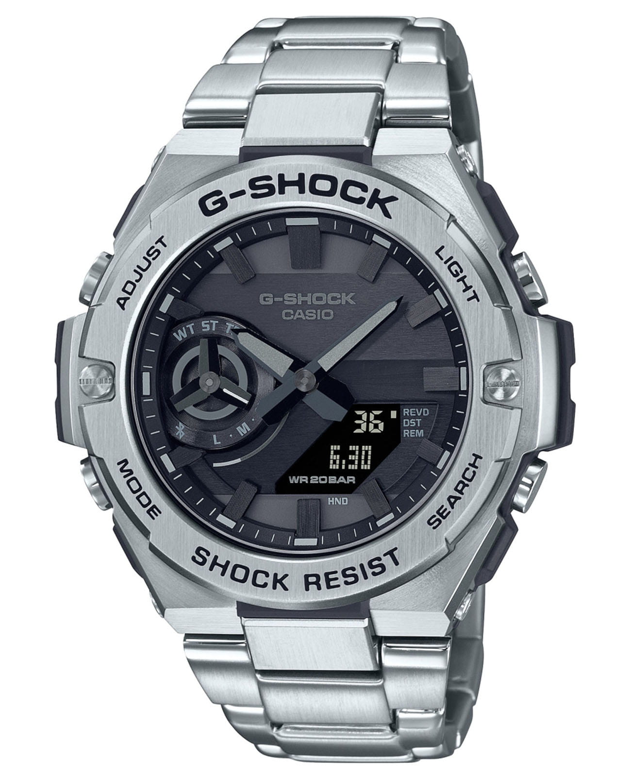 Японские мужские часы-хронографХронографФункция позволяет измерять отрезки времени с особой точностью: часы, минуты, секунды. Верным признаком хронографа является наличие на циферблате 3 дополнительных окошек-счётчиков. с минеральным стекломМинеральное стеклоМинеральное стекло представляет собой искусственно выращенный минерал кварца. Такое стекло отличается особой устойчивостью к повреждениям и царапинам. Уступает по некоторым качествам сапфировому стеклу. Casio G-Shock GST-B500D-1A1, кварцевый механизм с высокой точностью. Линейка GST-B500 объединяет в себе все самое необходимое, что нужно современным мужчинам. КарбоновыйКарбонОт «carbon», «carbone» - углерод, углепластик - полимерный композиционный материал из переплетённых под определенным углом между собой нитей углеродного волокна, применяется для изготовления лёгких, но прочных деталей. В часах часто используют для украшения циферблатов и ремешков. Так же карбон используется в изготовлении корпусов. Такие корпуса обладают антикоррозионным свойством, не поддаются электромагнитному излучению, обладают повышенной прочностью и противоударностью. каркас поглощает внешние удары, обеспечивая истинную прочность G-STEEL, а удобная посадка на запястье добавляет комфорта. Уменьшенная защита кнопок позволила создать тонкие, но в то же время широкие кнопки, которые легко нажимать. БезельБезельВнешний ободок, закрепляющий стекло. В спортивных часах так называется поворотное кольцо с делениями на циферблате, выполняет роль таймера – замеряет отрезки времени на шкале. Неподвижный безель – элемент декора. Однонаправленно вращающийся безель на дайверских часах позволяет фиксировать моменты погружения и выныривания на поверхность. подвергался многократной обработке для создания исключительной металлической текстуры, видимой под любым углом, что позволяет добиться изысканного вида. Питание от солнечной энергии Tough SolarTough SolarТехнология основана на подзарядке аккумулятора от источника солнечного света, специальная панель улавливает солнечные лучи и преобразует их в энергию для работы часов. Достаточно пары минут нахождения на солнце для функционирования часов в течении суток. солнечные батарейки большой мощности, индикатор заряда батареи. Функция автоматического сохранения энергии. Время работы аккумулятора без подзарядки приблизительно 7 месяцев, при включенной функции сохранения энергии приблизительно 18 месяцев. Механизм часов помещен в корпус из прочного материала, который надежно защищает от внешних воздействий, от ударов и вибрации. Carbon Core GuardCarbon Core Guard Новейшая структура корпуса, разработанная Casio. Полиуретановая пластина дополнительно усилена карбоновыми вставками, что придаёт специальную защиту от механических повреждений. Карбон отличается лёгкостью и прочностью. объединяет корпус и заднюю крышку в единый карбоновый моноблок. Ударопрочный корпусУдаропрочный корпусМеханизм заключён в корпус, выполненный из современных материалов, устойчивых к ударам, механическим повреждениям и падению с высоты: инновационный пластик, карбон, нержавеющая сталь, титан. из стали и полимерного материала защищает механизм от ударов и вибрации. Двойная светодиодная белая подсветка Super Illuminator с функцией Afterglow, одновременно подсвечивается аналоговый циферблат и цифровой дисплей. Све