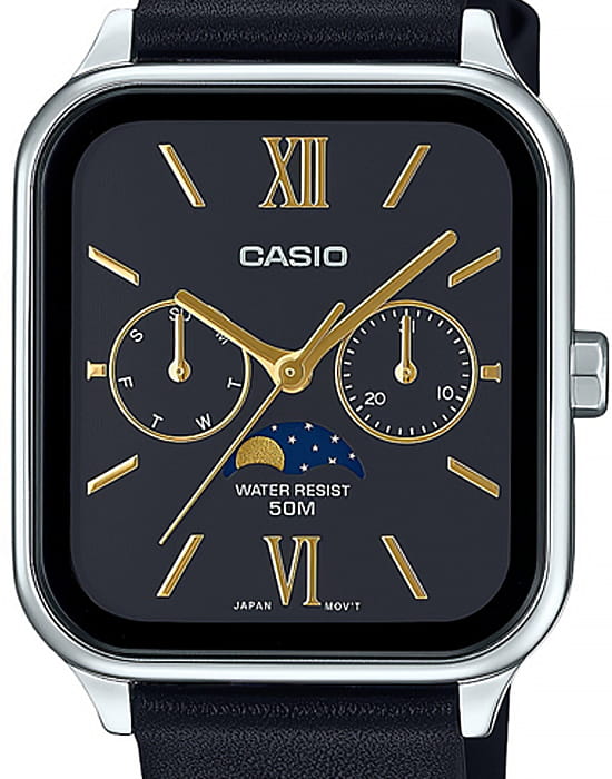 Японские мужские кварцевые часы с минеральным стекломМинеральное стеклоМинеральное стекло представляет собой искусственно выращенный минерал кварца. Такое стекло отличается особой устойчивостью к повреждениям и царапинам. Уступает по некоторым качествам сапфировому стеклу. Casio Collection MTP-M305L-1A2VDF (MTP-M305L-1A2), кварцевый механизм с высокой точностью. Корпус часов изготовлен из нержавеющей стали. Циферблат с метками в виде штрихов. Особенностью модели является наличие индикатора фазы луны над шестью часами по циферблату. Индикатор имеет 4 положения и отображается новолуние и полнолуние, а также растущую и убывающую Луну. Батарейка рассчитана на 3 года. Класс водозащиты: 50 метров, позволит защитить корпус от случайных брызг или капель дождя. Кожаный ремешок на стандартной застежке.