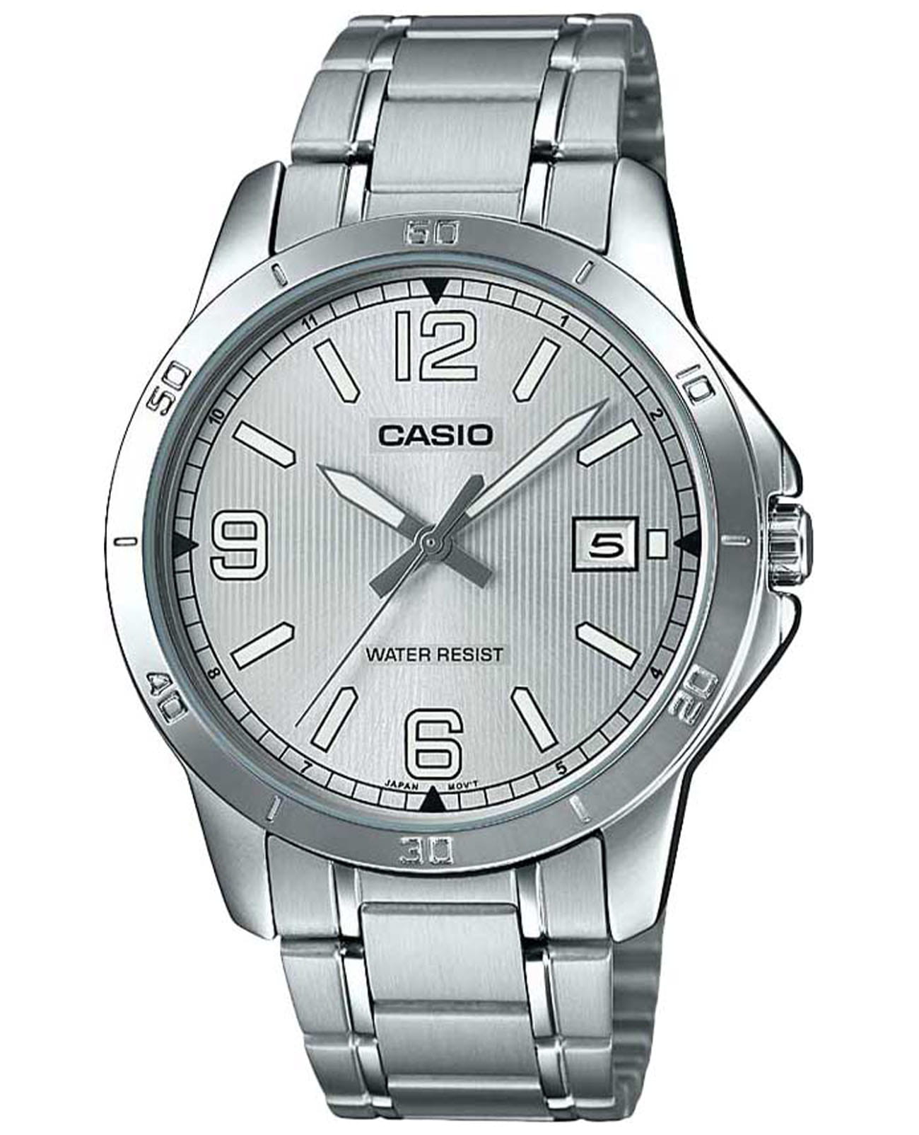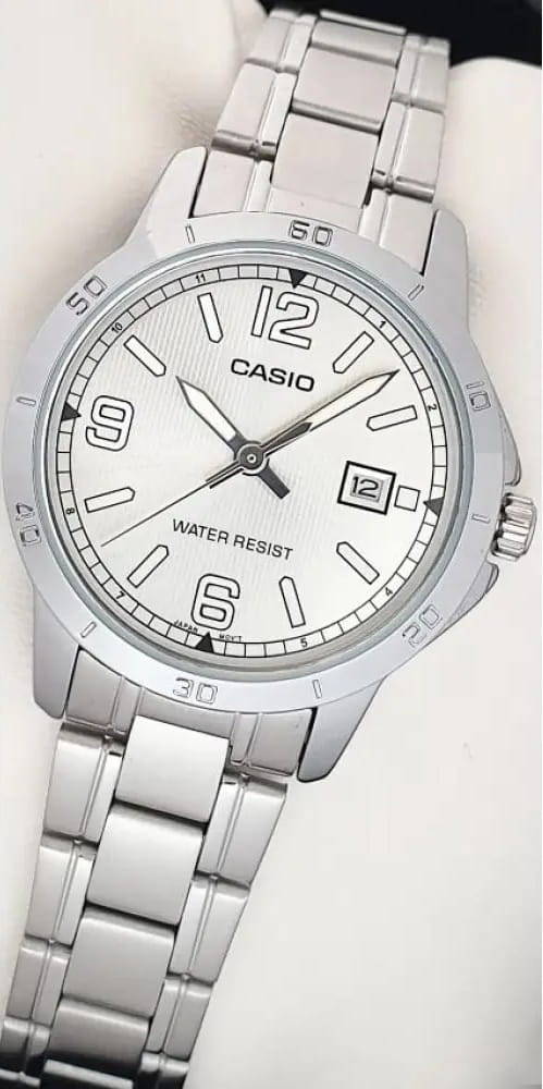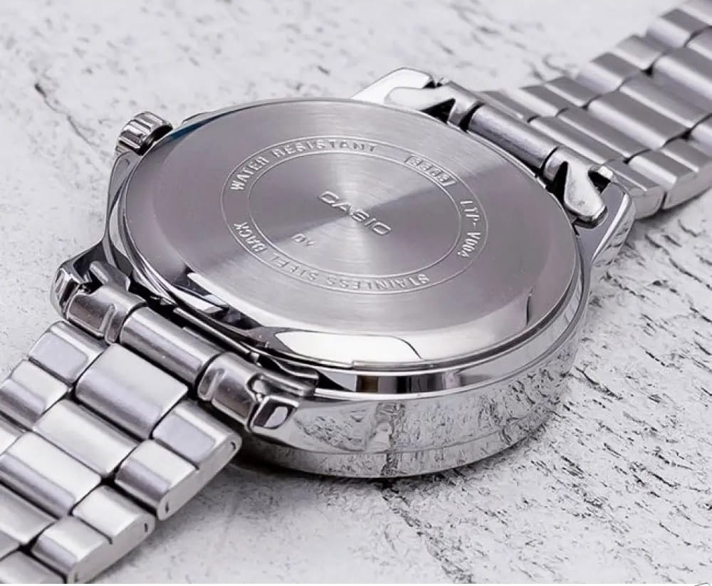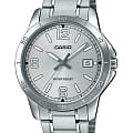 Японские мужские кварцевые часы с минеральным стекломМинеральное стеклоМинеральное стекло представляет собой искусственно выращенный минерал кварца. Такое стекло отличается особой устойчивостью к повреждениям и царапинам. Уступает по некоторым качествам сапфировому стеклу. Casio Collection MTP-V004D-7B2, кварцевый механизм с высокой точностью. Класс водозащиты: 30 метров, позволит защитить корпус от случайных брызг или капель дождя. Корпус часов изготовлен из стали. Стальной браслет на раскладной застёжкеРаскладная застёжкаТакой тип застёжки используется только на браслетах из металла. Она никогда не раскрывается полностью, происходит разделение на 2 и более частей. Раскладывающая застёжка снизит вероятность потери часов к минимуму.. Окошко даты находится в положении 3 часа.