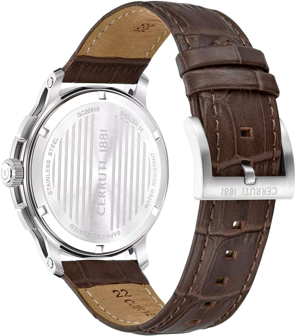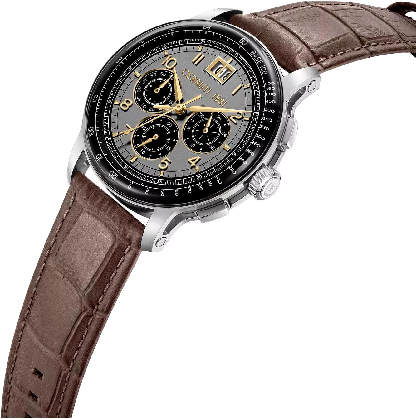 Cerruti 1881 CIWGC0084602 — выразительные мужские часы, выполненные в гармоничном сочетании стали, тёплого коричневого ремня и насыщенного чёрного циферблата. Модель оснащена функциональным хронографомХронографФункция позволяет измерять отрезки времени с особой точностью: часы, минуты, секунды. Верным признаком хронографа является наличие на циферблате 3 дополнительных окошек-счётчиков. с тремя счётчиками и крупным окном даты на «12 часах», что подчёркивает её практичность и динамичный характер. Корпус из нержавеющей стали защищён прочным минеральным стекломМинеральное стеклоМинеральное стекло представляет собой искусственно выращенный минерал кварца. Такое стекло отличается особой устойчивостью к повреждениям и царапинам. Уступает по некоторым качествам сапфировому стеклу., устойчивым к мелким повреждениям. Циферблат дополнен тахиметрической шкалой по безелюБезельВнешний ободок, закрепляющий стекло. В спортивных часах так называется поворотное кольцо с делениями на циферблате, выполняет роль таймера – замеряет отрезки времени на шкале. Неподвижный безель – элемент декора. Однонаправленно вращающийся безель на дайверских часах позволяет фиксировать моменты погружения и выныривания на поверхность. с PVD-покрытиемPVDУльтратонкое покрытие наносится в технике вакуумного напыления, сочетает в себе нитрид титана особой прочности со слоем золота или оксида хрома. Несёт в себе декоративную или защитную функцию., позволяющей измерять скорость движения. Элегантный ремень из натуральной кожи с аккуратной прострочкой застёгивается надёжной стандартной застежкой, обеспечивая комфорт и долговечность. Модель объединяет классическую утончённость и спортивный дух, оставаясь универсальным аксессуаром для современного мужчины.