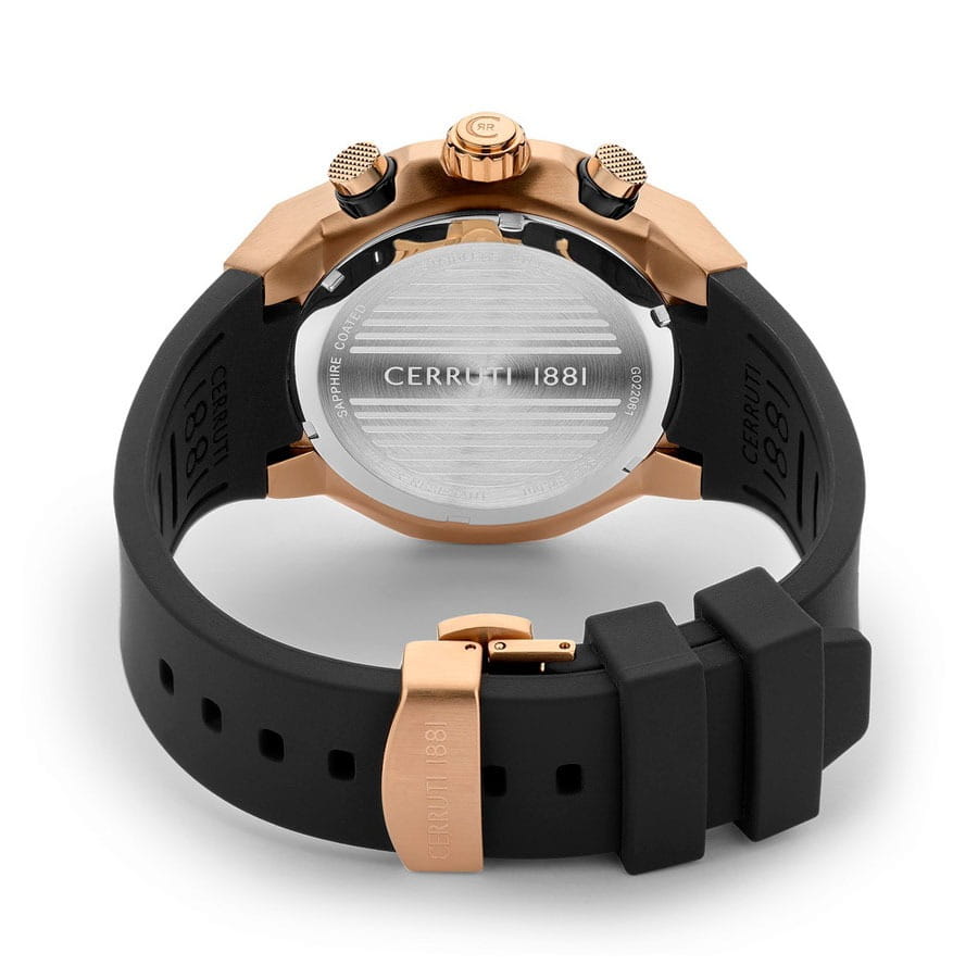 Мужские часы-хронографХронографФункция позволяет измерять отрезки времени с особой точностью: часы, минуты, секунды. Верным признаком хронографа является наличие на циферблате 3 дополнительных окошек-счётчиков. с секундомеромСекундомерСекундоме́р — прибор, способный измерять интервалы времени с точностью до долей секунды. Cerruti 1881 Lucardo CIWGO2206102 — это воплощение элегантности и современного стиля, сочетающее в себе передовые технологии и изысканный дизайн. Оснащенные кварцевым механизмом, эти часы обеспечивают высокую точность хода, что особенно важно для тех, кто ценит надежность и пунктуальность. Минеральное стеклоМинеральное стеклоМинеральное стекло представляет собой искусственно выращенный минерал кварца. Такое стекло отличается особой устойчивостью к повреждениям и царапинам. Уступает по некоторым качествам сапфировому стеклу. защищает циферблат от мелких механических повреждений, сохраняя его первоначальный блеск и ясность на протяжении долгого времени. Корпус часов изготовлен из качественной стали с золотистый IP-покрытиемIP-покрытиеМетод ионного напыления. Демонстрирует повышенную устойчивость к истиранию, окислению и химическим веществам. Под воздействием высокого давления и температуры около 1500°C молекулы металла надёжно соединяются с частицами корпуса часов., что придаёт конструкции прочность и устойчивость к внешним воздействиям. Особого внимания заслуживает безельБезельВнешний ободок, закрепляющий стекло. В спортивных часах так называется поворотное кольцо с делениями на циферблате, выполняет роль таймера – замеряет отрезки времени на шкале. Неподвижный безель – элемент декора. Однонаправленно вращающийся безель на дайверских часах позволяет фиксировать моменты погружения и выныривания на поверхность. с черным IP-покрытиемIP-покрытиеМетод ионного напыления. Демонстрирует повышенную устойчивость к истиранию, окислению и химическим веществам. Под воздействием высокого давления и температуры около 1500°C молекулы металла надёжно соединяются с частицами корпуса часов., который не только защищает часы, но и добавляет им изысканный вид. На циферблате расположены два дополнительных индикатора, которые делают функциональность часов ещё более широкой и удобной. Окошко даты, находящееся в положении 6 часов, обеспечивает дополнительное удобство, позволяя быстро и легко определить текущую дату. Стрелки и метки с люминесцентным покрытиемЛюминесцентное покрытиеПозволяет считывать показания времени в темноте. Производители наносят на стрелки, часовые индексы, безель или поверхность циферблата светонакопительный состав, дающий холодное свечение. обеспечивают отличную видимость даже в условиях недостаточного освещения. Класс водозащиты 100 метров позволяет владельцу не только плавать, но и нырять, а также заниматься другими водными видами спорта, не беспокоясь о сохранности часов. Силиконовый ремешок, оснащенный застёжкой-бабочкой с кнопкамиЗастёжка "бабочка"Такой вид застёжки дополняется предохранителями, помогающими избежать случайного раскрытия браслета. Обладают изящным исполнением. , обеспечивает надежную фиксацию на запястье и добавляет комфорта при носке, делая эти часы идеальными для активного образа жизни.