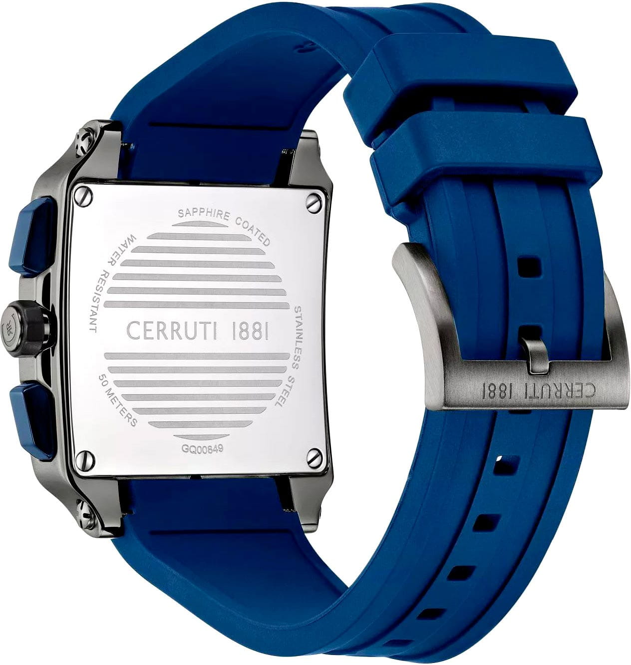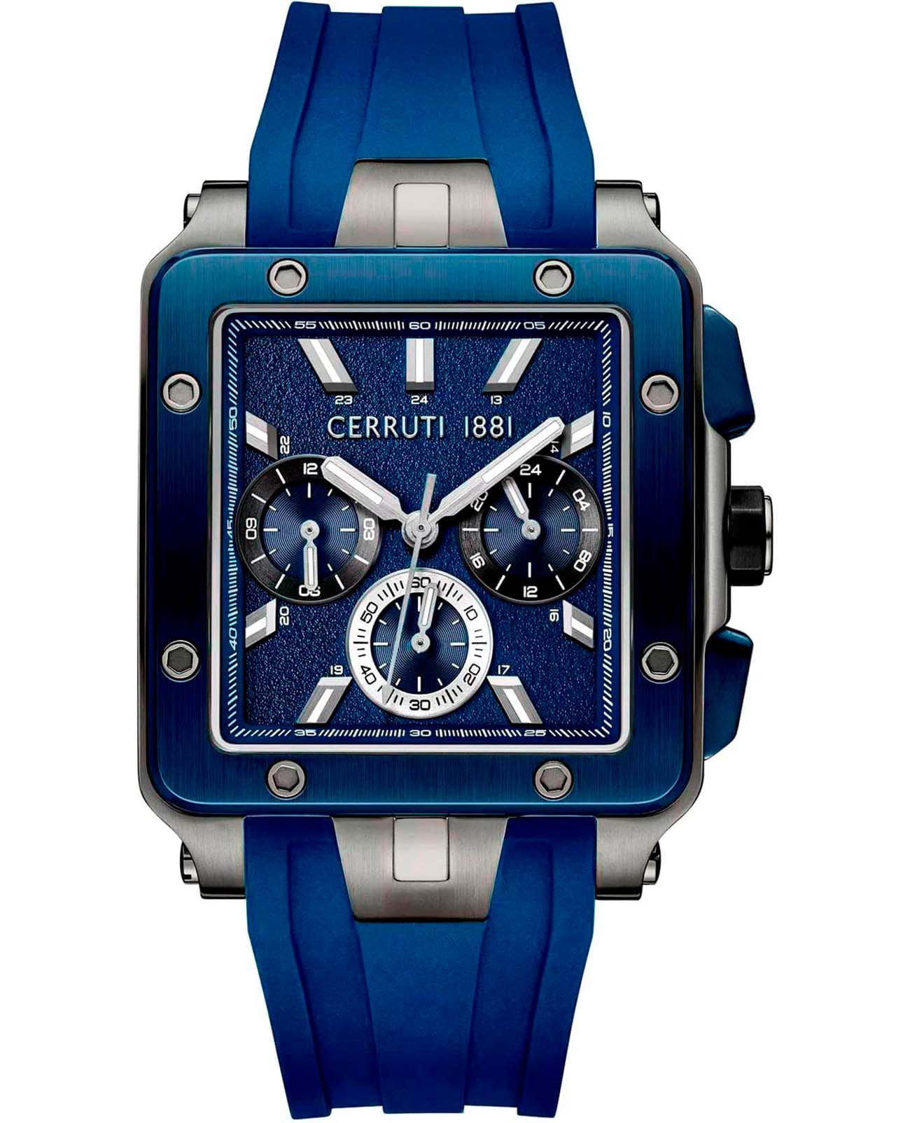 Мужские кварцевые часы Cerruti 1881 Odissea Master CIWGQ0084903 — массивный и функциональный аксессуар в квадратном корпусе с итальянским характером. Корпус из нержавеющей стали 316L с PVD-покрытиемPVDУльтратонкое покрытие наносится в технике вакуумного напыления, сочетает в себе нитрид титана особой прочности со слоем золота или оксида хрома. Несёт в себе декоративную или защитную функцию., размером 40 мм, сочетает матовую и полированную отделку. Циферблат — синий, матовый зернистый, с фирменным логотипом и штриховыми накладными метками. Поддержка 12/24-часового формата времени. Функция хронографаХронографФункция позволяет измерять отрезки времени с особой точностью: часы, минуты, секунды. Верным признаком хронографа является наличие на циферблате 3 дополнительных окошек-счётчиков. дополняется декоративным накладным безелемБезельВнешний ободок, закрепляющий стекло. В спортивных часах так называется поворотное кольцо с делениями на циферблате, выполняет роль таймера – замеряет отрезки времени на шкале. Неподвижный безель – элемент декора. Однонаправленно вращающийся безель на дайверских часах позволяет фиксировать моменты погружения и выныривания на поверхность. с болтами. Стрелки в стиле Baton и метки с люминесцентным покрытиемЛюминесцентное покрытиеПозволяет считывать показания времени в темноте. Производители наносят на стрелки, часовые индексы, безель или поверхность циферблата светонакопительный состав, дающий холодное свечение.. Стекло — минеральноеМинеральное стеклоМинеральное стекло представляет собой искусственно выращенный минерал кварца. Такое стекло отличается особой устойчивостью к повреждениям и царапинам. Уступает по некоторым качествам сапфировому стеклу. с сапфировым покрытием. Ремешок — силиконовый на стандартной застёжке. Водонепроницаемость 50 м. Идеальный выбор для тех, кто ценит итальянский дизайн и спортивную функциональность.