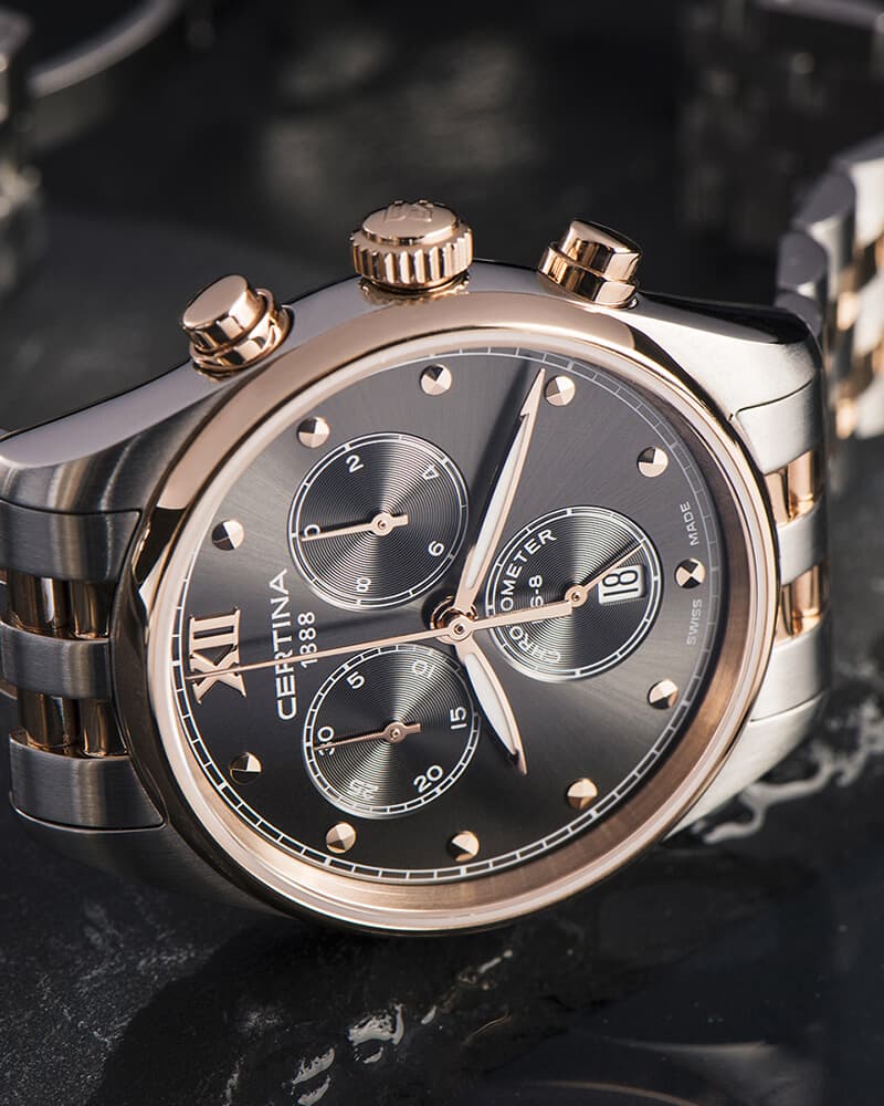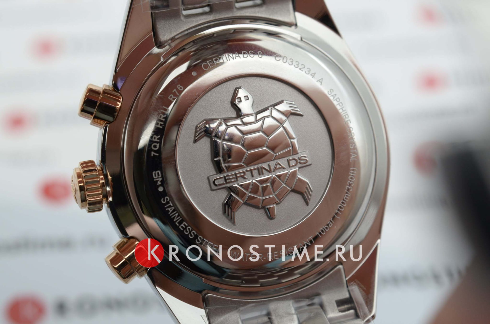 Женские швейцарские часы Certina DS-8 Lady Chronograph C033.234.11.118.00 из коллекции DS-8 – идеальное украшение образа. Модель имеет высокую точность хода швейцарского кварцевого калибра ETA G15.212 Precidrive™Precidrive™Инновационный кварцевый механизм Certina. Часы, оснащённые этим швейцарским калибром, приравниваются к точности к сертифицированным хронометрам, точность хода составляет +/-10 секунд в год.. Это подтверждается сертификатом COSCСертификат COSCОфициальный сертификат, подтверждающий то, что часы ходят с особо высокой точностью. Для получения документа часы подвергаются тестовым испытаниям, разработанным швейцарским институтом тестирования хронометров COSC. Допустимая норма для механических часов -4/+6 секунд в день, для кварцевых моделей +/- 0,07 секунд в день.. Система Двойной Надёжности DSDS ConceptDouble Security Concept, обозначает двойную надёжность и безупречную точность часов Certina. Двойная система защиты подразумевает обеспечение максимальной устойчивости к ударам и высоких показателей водонепроницаемости.. Сапфировое стеклоСапфировое стеклоПрочный и надёжный материал из кристалла сапфира синтетического происхождения, характеризующийся особой твёрдостью и устойчивостью к царапинам и повреждениям. с обработкой «антиблик». ХронографХронографФункция позволяет измерять отрезки времени с особой точностью: часы, минуты, секунды. Верным признаком хронографа является наличие на циферблате 3 дополнительных окошек-счётчиков., секундомер, дата, EOLEOLПредставляет собой систему, уведомляющую владельца часов о необходимости замены элемента питания. За 2 недели до полного разряда батарейки секундная стрелка перестаёт ходить чётко и начинает перепрыгивать на 3-4 деления.. Частичное PVD-покрытиеPVDУльтратонкое покрытие наносится в технике вакуумного напыления, сочетает в себе нитрид титана особой прочности со слоем золота или оксида хрома. Несёт в себе декоративную или защитную функцию.. Производство и сборка: Швейцария.