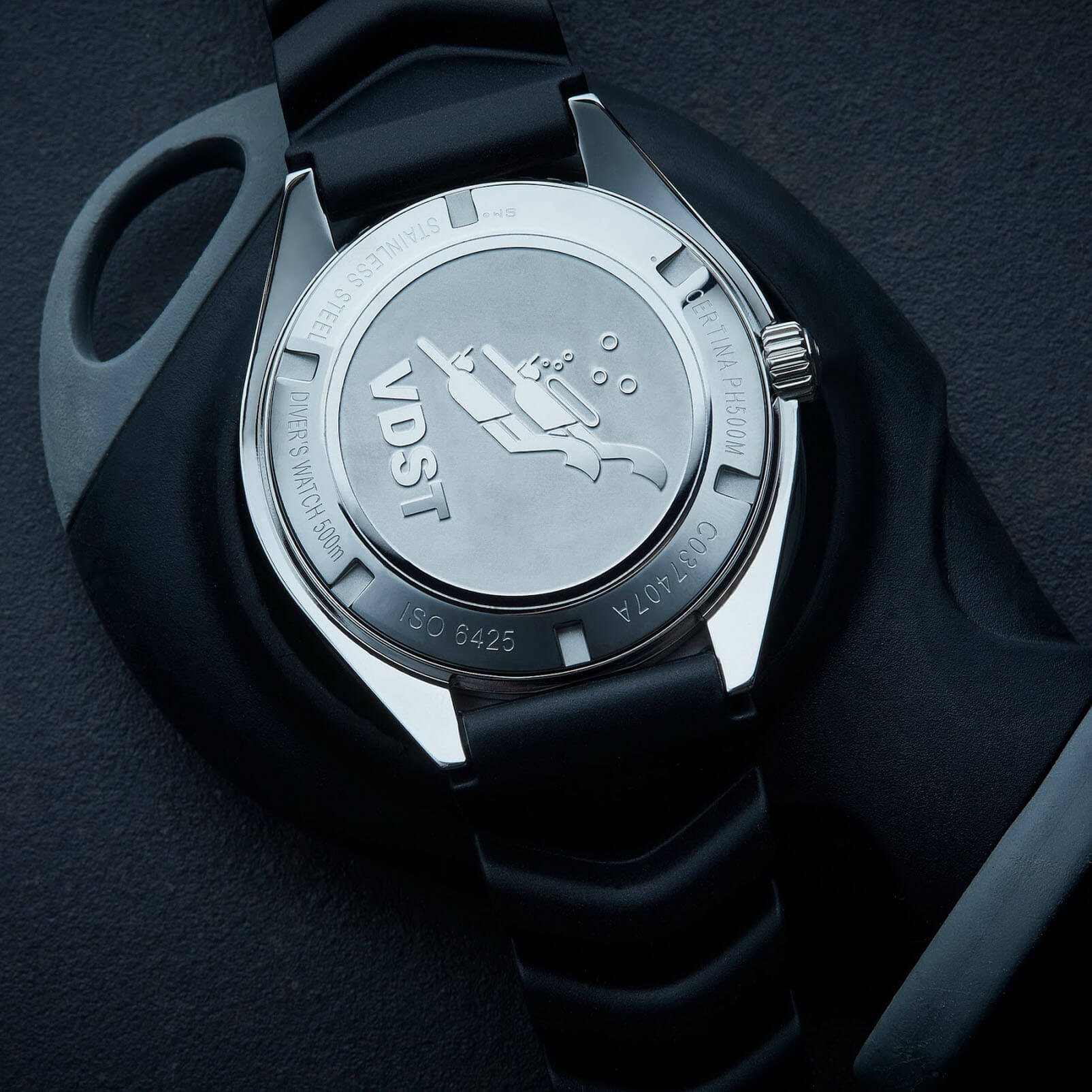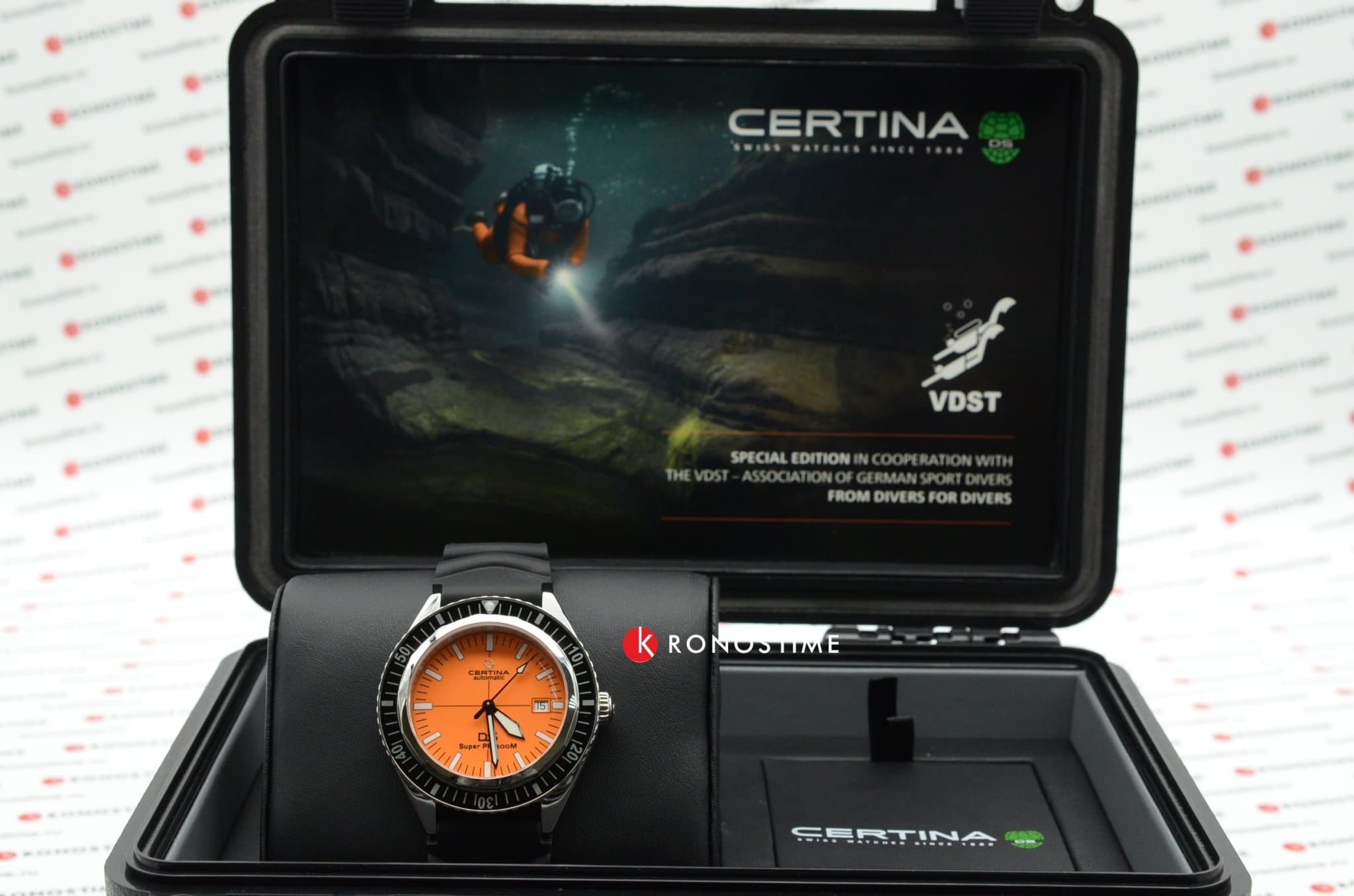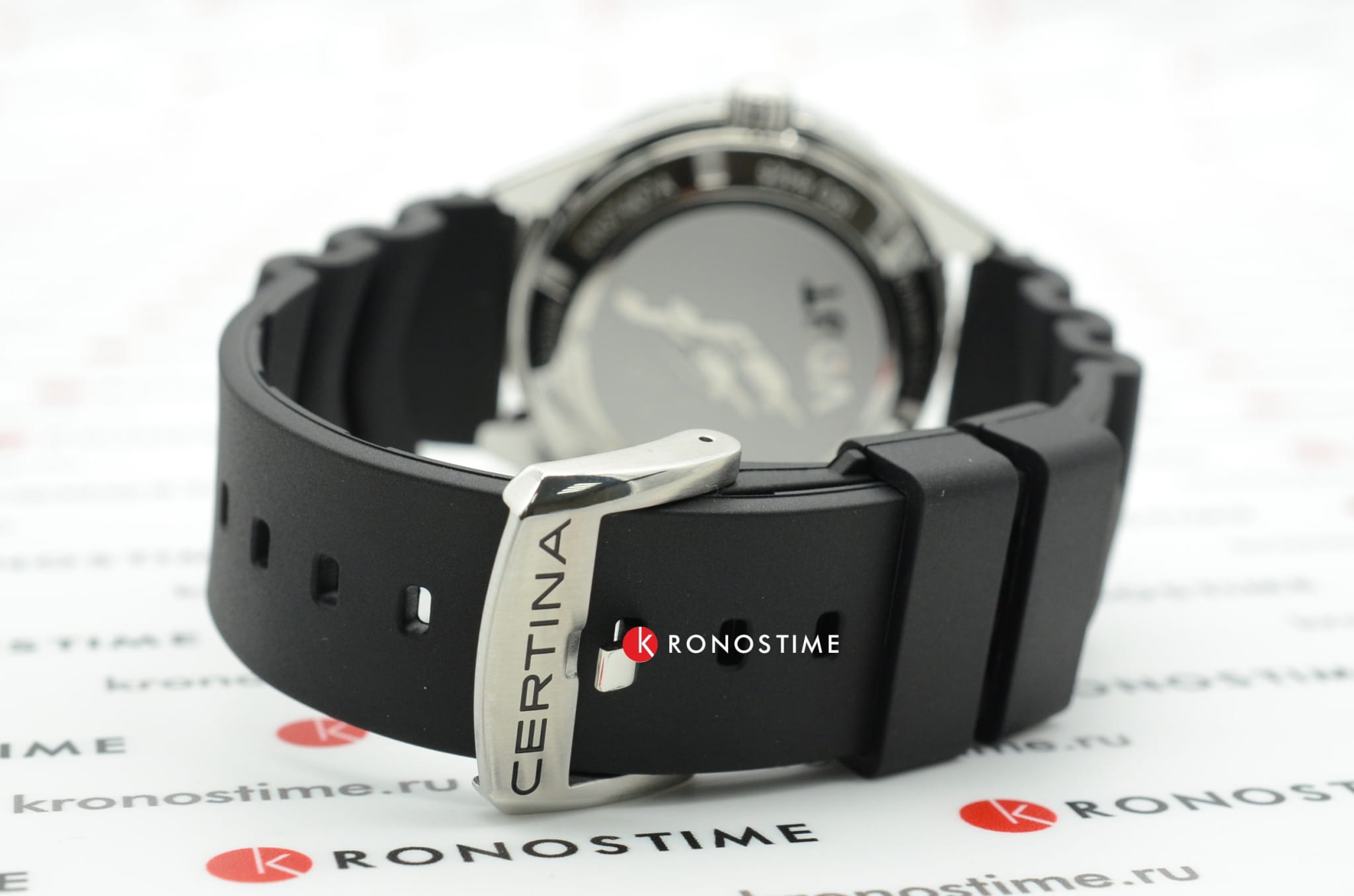 Оригинальный чёрный циферблат понравится ценителям ретро-дизайна. В комплекте с тканевым ремешком вы получаете дополнительный вариант из стали. Меняя их, вы можете экспериментировать с разными стилями. Уникальностью обладает не только аксессуар, но и упаковка, сделанная в виде бокса для дайвинга. Часы комплектуются автоматическим механизмом ETA Powermatic 80Powermatic 80Эксклюзивный калибр от швейцарской компании ETA с увеличенным запасом хода до 80 часов за счёт удлинённой заводной пружины. Характеризуется улучшенной системой спуска со сниженным трением. с 80-часовым запасом хода. Технология DS ConceptDS ConceptDouble Security Concept, обозначает двойную надёжность и безупречную точность часов Certina. Двойная система защиты подразумевает обеспечение максимальной устойчивости к ударам и высоких показателей водонепроницаемости.. Стекло с покрытием Nex scratchguard, устойчивым к царапинам. Вращающийся безельБезельВнешний ободок, закрепляющий стекло. В спортивных часах так называется поворотное кольцо с делениями на циферблате, выполняет роль таймера – замеряет отрезки времени на шкале. Неподвижный безель – элемент декора. Однонаправленно вращающийся безель на дайверских часах позволяет фиксировать моменты погружения и выныривания на поверхность.. Диаметр корпуса: 42,8 мм.