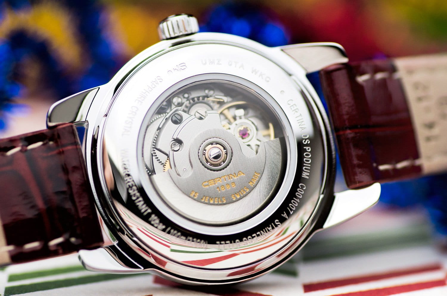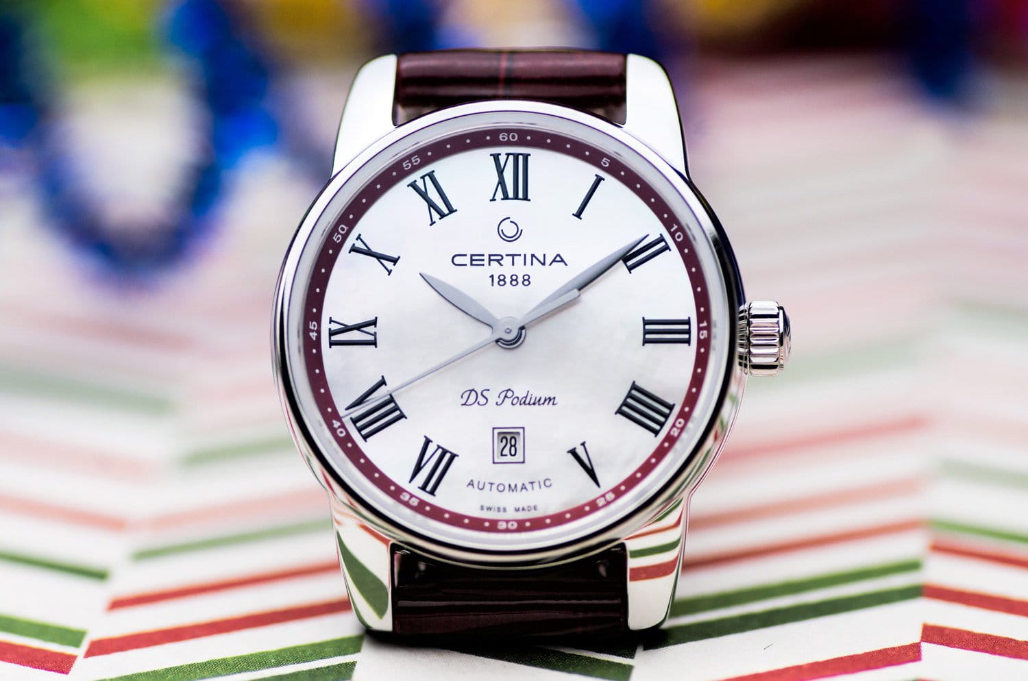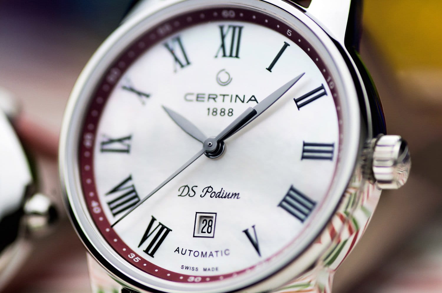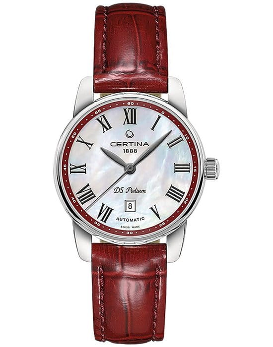 Элегантный аксессуар обладает вневременным дизайном, перламутровый циферблат дополнен римскими цифрами с винтажным оттенком. Часы с автоматической системой завода для своей работы используют энергию от движений руки носительницы, позволяя забыть о необходимости регулярного завода. Швейцарский механизм ETA 2671 с 38-часовым запасом хода. Скелетонизированная задняя крышка. Сапфировое стекло с двухсторонней обработкой «антиблик». Концепция Double SecurityDS ConceptDouble Security Concept, обозначает двойную надёжность и безупречную точность часов Certina. Двойная система защиты подразумевает обеспечение максимальной устойчивости к ударам и высоких показателей водонепроницаемости.. Корпус из нержавеющей стали 316L. Водозащита 100 метров. Ярко-красный ремешок из натуральной кожи. . Отображение числа. Диаметр корпуса: 29 мм.