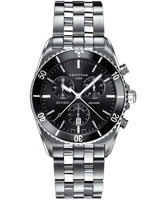 Швейцарские мужские часы Certina DS First C014.417.44.081.00 из коллекции DS First станут стильным дополнением к образу мужчины, ведущего активный образ жизни. Высокоточный хронографХронографФункция позволяет измерять отрезки времени с особой точностью: часы, минуты, секунды. Верным признаком хронографа является наличие на циферблате 3 дополнительных окошек-счётчиков. отличается спортивным исполнением. Наручные часы изготовлены из титана, безельБезельВнешний ободок, закрепляющий стекло. В спортивных часах так называется поворотное кольцо с делениями на циферблате, выполняет роль таймера – замеряет отрезки времени на шкале. Неподвижный безель – элемент декора. Однонаправленно вращающийся безель на дайверских часах позволяет фиксировать моменты погружения и выныривания на поверхность. сделан из керамики. Они основаны на концепции DS ConceptDS ConceptDouble Security Concept, обозначает двойную надёжность и безупречную точность часов Certina. Двойная система защиты подразумевает обеспечение максимальной устойчивости к ударам и высоких показателей водонепроницаемости., что подразумевает повышенную ударопрочность и водонепроницаемость WR 200. На поверхность сапфирового стекла нанесено антибликовое покрытие. Швейцарский кварцевый механизм ETA под номером 251.262. Заводная головка с защитным уплотнением. Задняя крышка с гравировкой. Люминесцентная подсветкаЛюминесцентное покрытиеПозволяет считывать показания времени в темноте. Производители наносят на стрелки, часовые индексы, безель или поверхность циферблата светонакопительный состав, дающий холодное свечение.. Секундомер, отображение даты. Диаметр корпуса: 41 мм. Производство и сборка: Швейцария