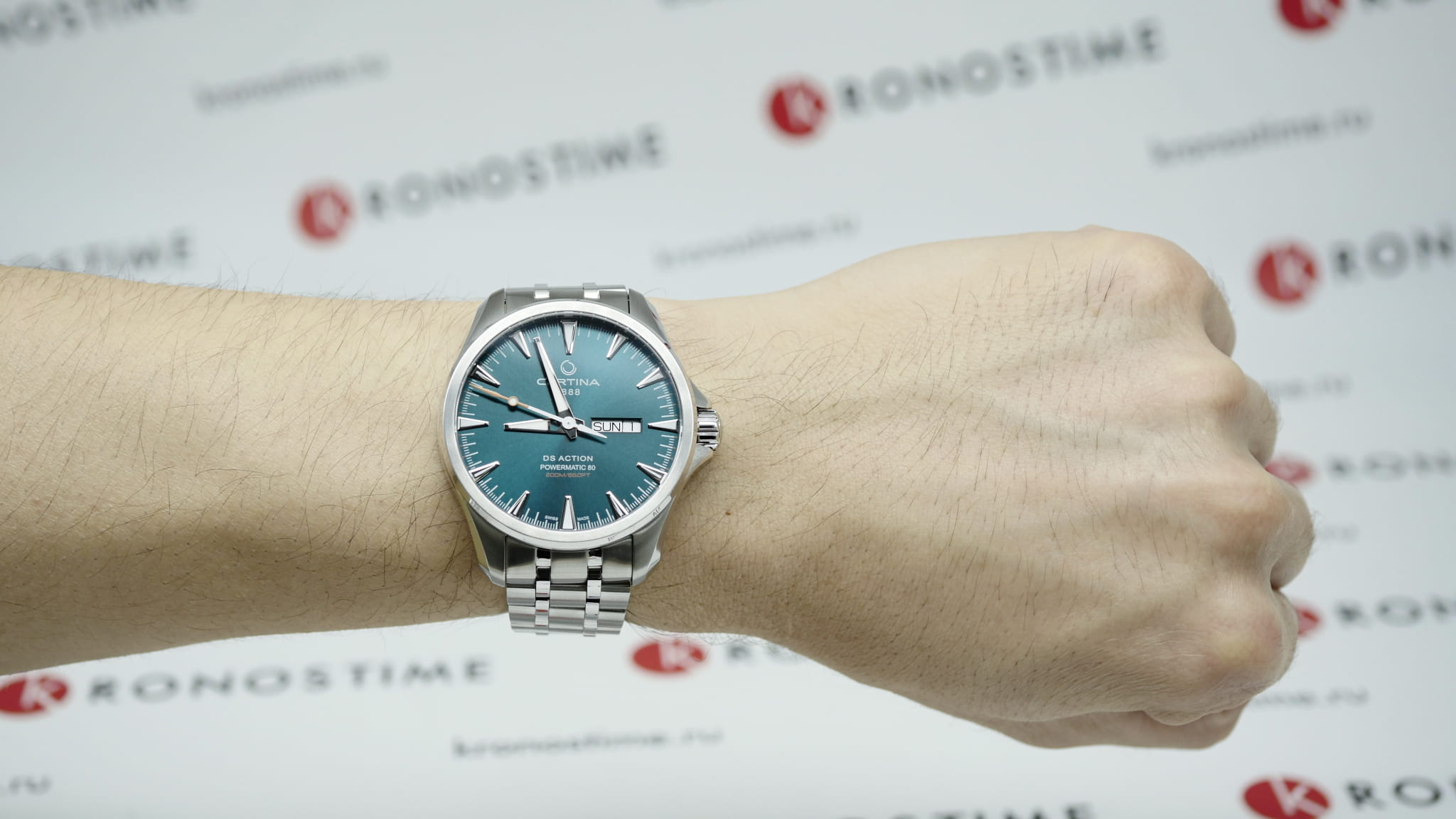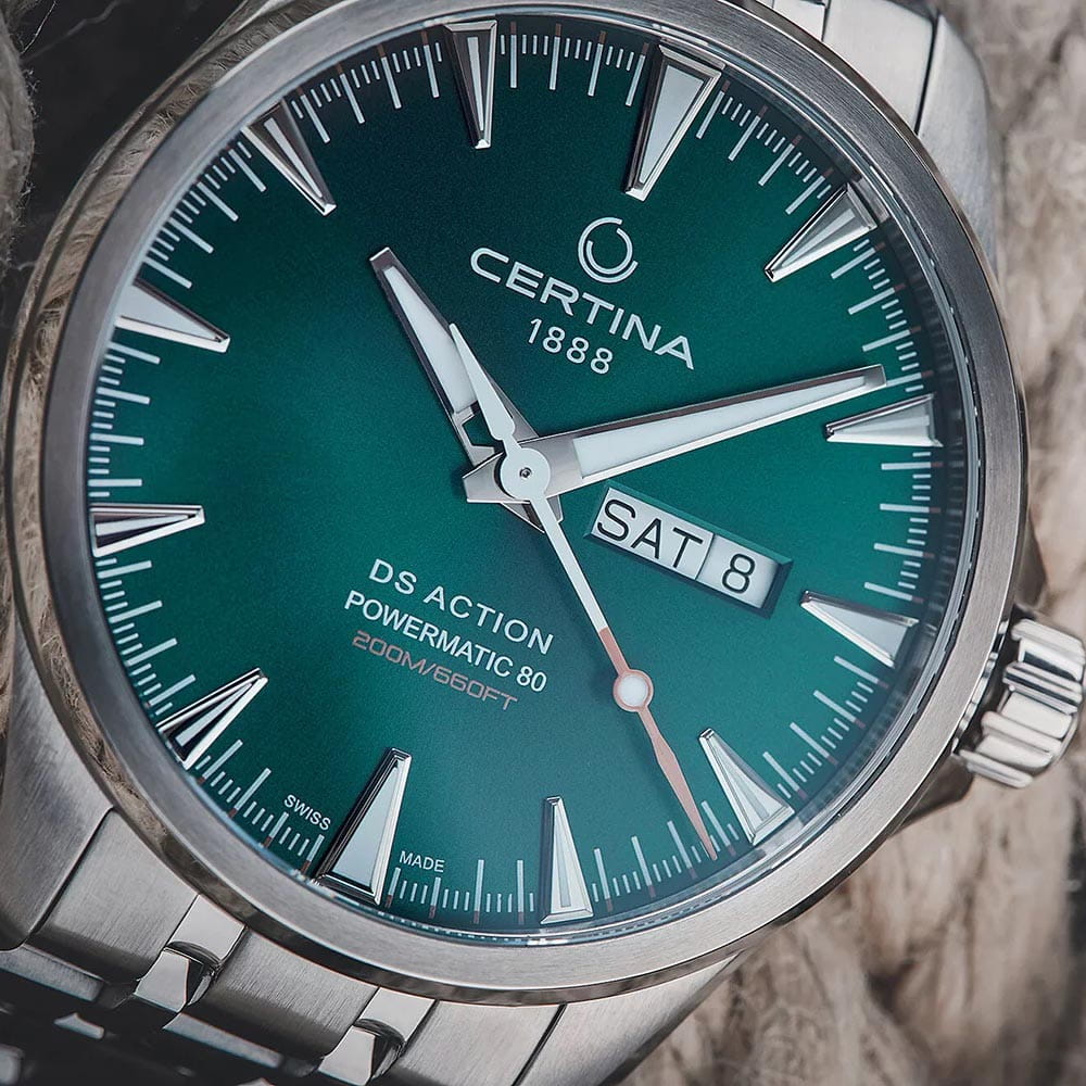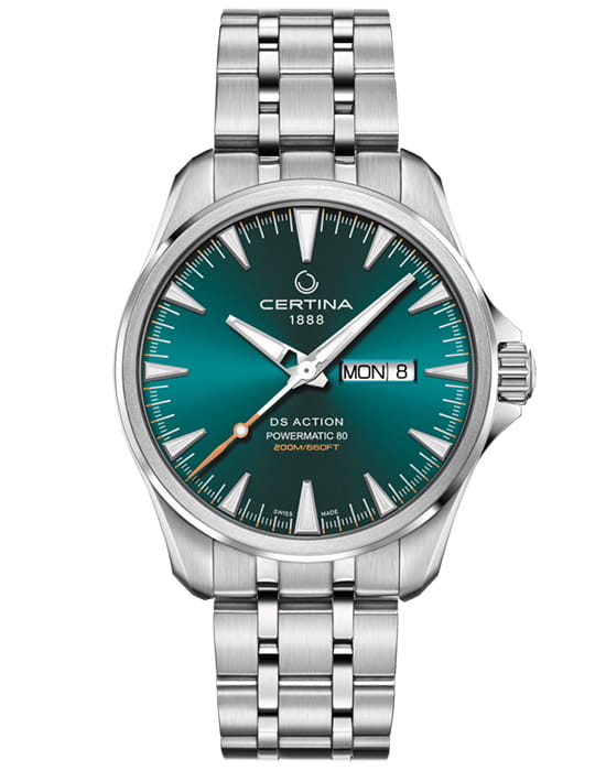 Брендовая модель имеет изумрудный циферблат с контрастными стрелками и часовой разметкой, что обеспечивает хорошую читаемость показателей в любых условиях. Стальной браслет надёжно обхватывает запястье, а предотвращает случайное расстёгивание. Часы работают за счёт швейцарского пружинного механизма ETA Powermatic 80Powermatic 80Эксклюзивный калибр от швейцарской компании ETA с увеличенным запасом хода до 80 часов за счёт удлинённой заводной пружины. Характеризуется улучшенной системой спуска со сниженным трением., его запас хода увеличен до 80 часов. Соблюдение DS ConceptDS ConceptDouble Security Concept, обозначает двойную надёжность и безупречную точность часов Certina. Двойная система защиты подразумевает обеспечение максимальной устойчивости к ударам и высоких показателей водонепроницаемости.. Корпус из нержавеющей стали 316L. Стекло из сапфира с покрытием «антиблик». Водостойкость 200 метров. Подсветка SuperLumiNovaЛюминесцентное покрытиеПозволяет считывать показания времени в темноте. Производители наносят на стрелки, часовые индексы, безель или поверхность циферблата светонакопительный состав, дающий холодное свечение.. Завинчивающаяся задняя крышка. Защищённая заводная головка. Календарь с индикацией числа и дня недели. Диаметр корпуса: 41 мм.