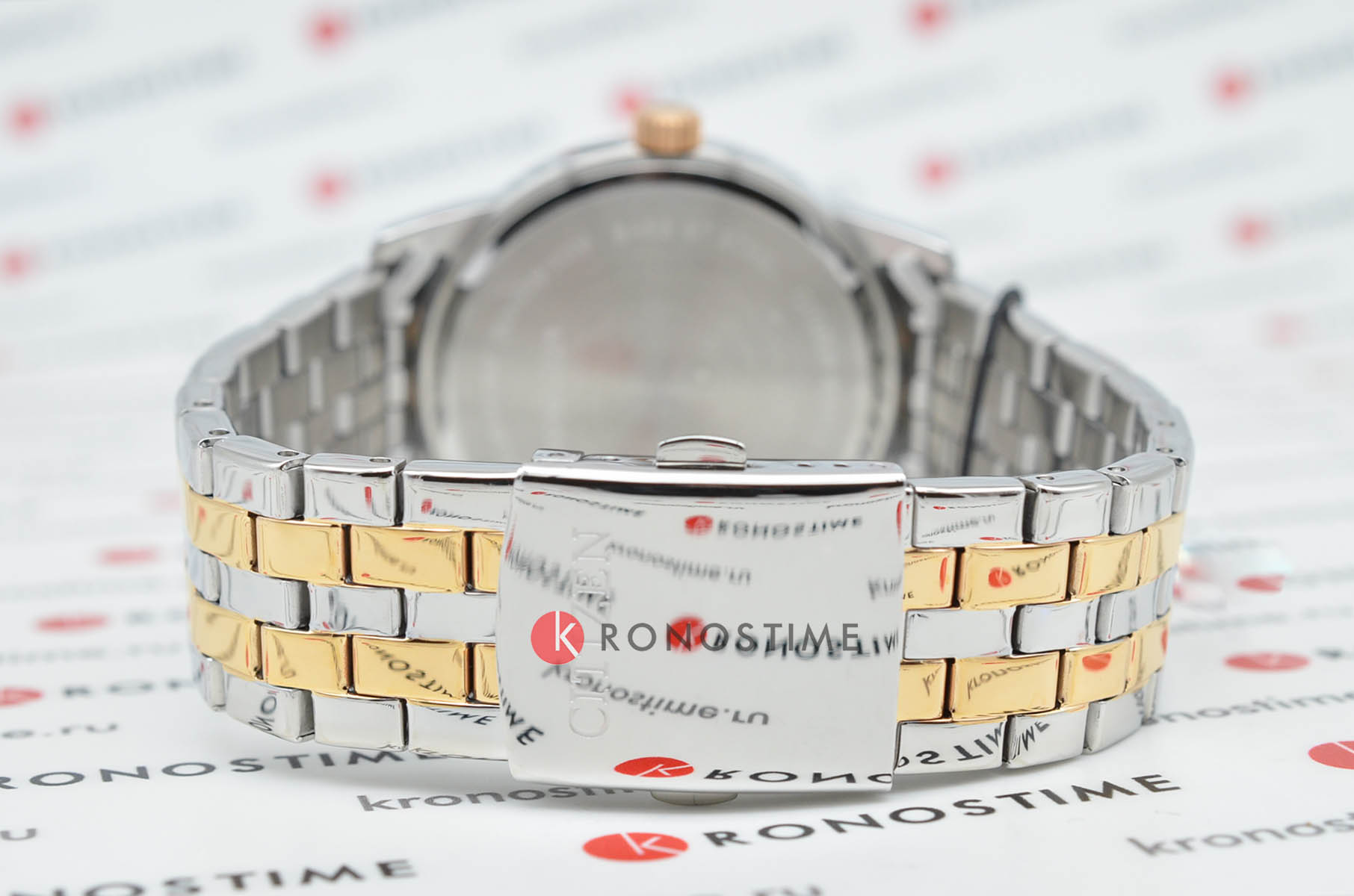 Часы Citizen AK5006-58A произведены в Японии и оснащены надёжным кварцевым механизмом калибра Citizen 6324. Корпус выполнен из нержавеющей стали и имеет классическую круглую форму диаметром 42 мм, а безельБезельВнешний ободок, закрепляющий стекло. В спортивных часах так называется поворотное кольцо с делениями на циферблате, выполняет роль таймера – замеряет отрезки времени на шкале. Неподвижный безель – элемент декора. Однонаправленно вращающийся безель на дайверских часах позволяет фиксировать моменты погружения и выныривания на поверхность. с элегантным золотистым IP-покрытиемIP-покрытиеМетод ионного напыления. Демонстрирует повышенную устойчивость к истиранию, окислению и химическим веществам. Под воздействием высокого давления и температуры около 1500°C молекулы металла надёжно соединяются с частицами корпуса часов.. Минеральное стеклоМинеральное стеклоМинеральное стекло представляет собой искусственно выращенный минерал кварца. Такое стекло отличается особой устойчивостью к повреждениям и царапинам. Уступает по некоторым качествам сапфировому стеклу. защищает серебристый циферблат, украшенный эффектом солнечных лучей по технологии Sunray. На циферблате расположены клиновидные стрелки в стиле Dauphine, метки в виде штрихов и римская цифра в положении 12 часов, а также индикатор фазы Луны — одно из самых востребованных усложнений в часовой классике. Часы защищены от воды по стандарту 50WR, что позволяет не бояться случайных брызг и дождя. Заводная головка отличается рифлёной поверхностью для удобства использования. Стальной браслет с частичным золотистым IP-покрытиемIP-покрытиеМетод ионного напыления. Демонстрирует повышенную устойчивость к истиранию, окислению и химическим веществам. Под воздействием высокого давления и температуры около 1500°C молекулы металла надёжно соединяются с частицами корпуса часов. и раскладной застёжкойРаскладная застёжкаТакой тип застёжки используется только на браслетах из металла. Она никогда не раскрывается полностью, происходит разделение на 2 и более частей. Раскладывающая застёжка снизит вероятность потери часов к минимуму. обеспечивает комфорт и надежную фиксацию на руке. В качестве элемента питания используется батарейка SR621SW, обеспечивающая автономную работу до двух лет.
