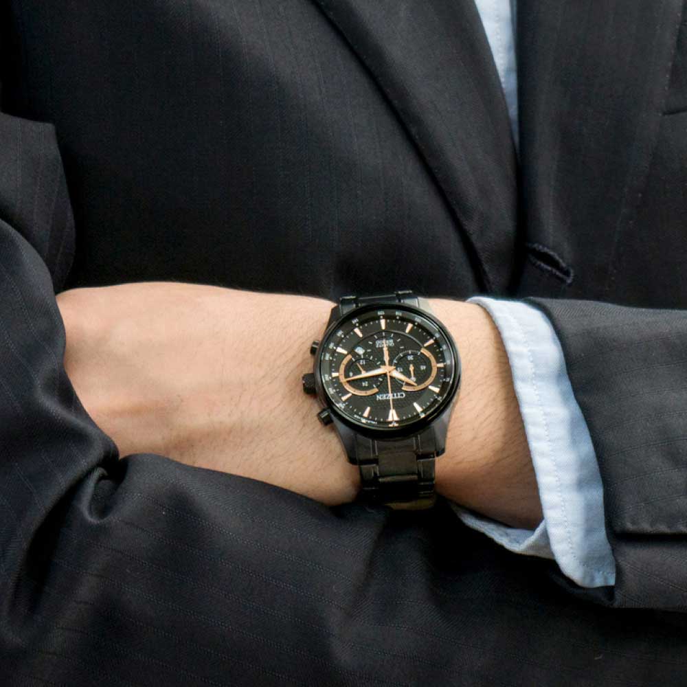 Citizen Chronograph AN8195-58E часы-хронографХронографФункция позволяет измерять отрезки времени с особой точностью: часы, минуты, секунды. Верным признаком хронографа является наличие на циферблате 3 дополнительных окошек-счётчиков. с секундомеромСекундомерСекундоме́р — прибор, способный измерять интервалы времени с точностью до долей секунды. и тахиметромТахиметрРазмеченная шкала, располагается на ободке или безеле часов. Тахиметр позволяет рассчитать скорость на определённом участке пути, расстояние измеряется в километрах или милях.. Корпус из нержавеющей стали с IP-покрытиемIP-покрытиеМетод ионного напыления. Демонстрирует повышенную устойчивость к истиранию, окислению и химическим веществам. Под воздействием высокого давления и температуры около 1500°C молекулы металла надёжно соединяются с частицами корпуса часов. диаметром 42 мм идеально сбалансирован. Минеральное стеклоМинеральное стеклоМинеральное стекло представляет собой искусственно выращенный минерал кварца. Такое стекло отличается особой устойчивостью к повреждениям и царапинам. Уступает по некоторым качествам сапфировому стеклу. обеспечивает отличную защиту циферблата от царапин. Часы работают на основе кварцевого механизма. Стальной браслет на раскладной застёжкеРаскладная застёжкаТакой тип застёжки используется только на браслетах из металла. Она никогда не раскрывается полностью, происходит разделение на 2 и более частей. Раскладывающая застёжка снизит вероятность потери часов к минимуму. идеально дополняют дизайн часов, обеспечивая комфортное ношение. Стрелки и метки на циферблате имеют люминесцентное покрытиеЛюминесцентное покрытиеПозволяет считывать показания времени в темноте. Производители наносят на стрелки, часовые индексы, безель или поверхность циферблата светонакопительный состав, дающий холодное свечение. позволяющее легко определять время даже в темноте. Циферблат украшен сотовым декоративным узором. Клиновидные стрелки в стиле Dauphine. Окошко даты находится между часовыми отметками 4 и 5. 12-ти и 24-х часовой формат времени отображается на отдельном циферблате. Часы обладают впечатляющей водонепроницаемостью до 100WR, что делает их идеальными для повседневной носки.