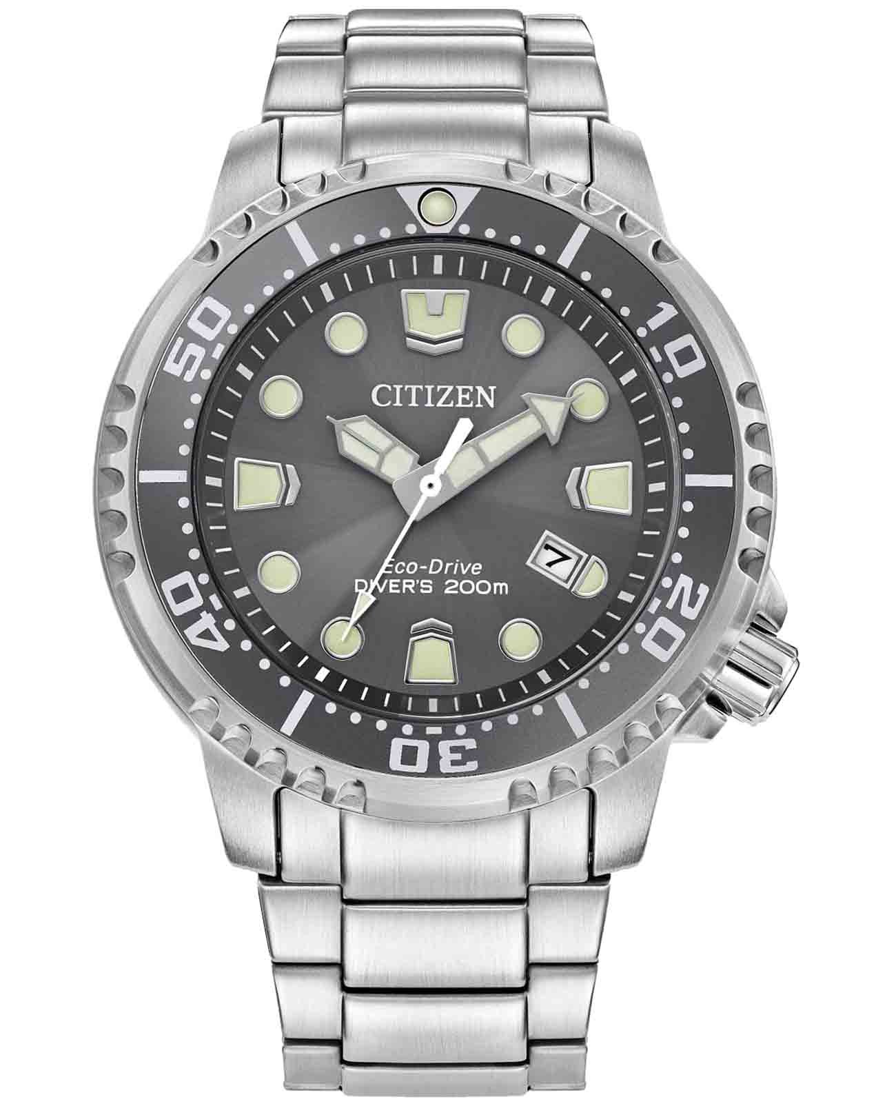 Мужские часы Citizen Promaster BN0167-50H спортивного дизайна с высоким уровнем водозащиты. Корпус из нержавеющей стали диаметром 44 мм идеально сбалансирован. Минеральное стеклоМинеральное стеклоМинеральное стекло представляет собой искусственно выращенный минерал кварца. Такое стекло отличается особой устойчивостью к повреждениям и царапинам. Уступает по некоторым качествам сапфировому стеклу. обеспечивает отличную защиту циферблата от царапин. Часы работают на основе кварцевого механизма, питание от солнечной энергии, запас энергии на 180 дней. Стальной браслет на раскладной застёжкеРаскладная застёжкаТакой тип застёжки используется только на браслетах из металла. Она никогда не раскрывается полностью, происходит разделение на 2 и более частей. Раскладывающая застёжка снизит вероятность потери часов к минимуму. идеально дополняют дизайн часов, обеспечивая комфортное ношение. Стрелки и метки на циферблате имеют люминесцентное покрытиеЛюминесцентное покрытиеПозволяет считывать показания времени в темноте. Производители наносят на стрелки, часовые индексы, безель или поверхность циферблата светонакопительный состав, дающий холодное свечение. позволяющее легко определять время даже в темноте. БезельБезельВнешний ободок, закрепляющий стекло. В спортивных часах так называется поворотное кольцо с делениями на циферблате, выполняет роль таймера – замеряет отрезки времени на шкале. Неподвижный безель – элемент декора. Однонаправленно вращающийся безель на дайверских часах позволяет фиксировать моменты погружения и выныривания на поверхность. вращается в одном направлении. Функция индикации заряда (EOL) и предотвращения перезарядки. Окошко даты находится в положении 4 часа. Часы обладают впечатляющей водонепроницаемостью до 200WR, что делает их идеальными для плавания, ныряния и погружений с аквалангом.