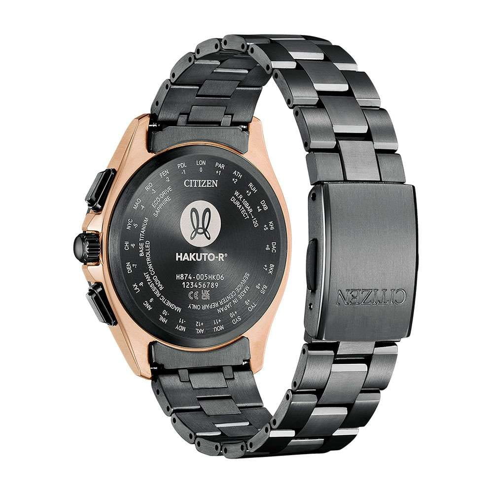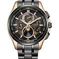 Часы Citizen BY1009-64Y — это гармоничное сочетание современного японского стиля, передовых технологий и высокого уровня надежности. Модель выполнена в прочном и легком корпусе из инновационного суперлегкого титана Super Titanium Duratect TIC с золотистым DLC-покрытиемDLC-покрытиеDiamond like carbon - одно из лучших видов покрытия, представляющее собой углерод с алмазными свойствами. На поверхность материала наносятся распавшиеся молекулы углерода, превращающиеся в плёнку из алмазоподобных связей, которая перенимает твёрдость алмаза. диаметром 41,5 мм и толщиной 10,8 мм, дополненном браслетом шириной 22 мм с удобной раскладной застёжкойРаскладная застёжкаТакой тип застёжки используется только на браслетах из металла. Она никогда не раскрывается полностью, происходит разделение на 2 и более частей. Раскладывающая застёжка снизит вероятность потери часов к минимуму.. БезельБезельВнешний ободок, закрепляющий стекло. В спортивных часах так называется поворотное кольцо с делениями на циферблате, выполняет роль таймера – замеряет отрезки времени на шкале. Неподвижный безель – элемент декора. Однонаправленно вращающийся безель на дайверских часах позволяет фиксировать моменты погружения и выныривания на поверхность. и браслет с элегантным черным DLC-покрытиемDLC-покрытиеDiamond like carbon - одно из лучших видов покрытия, представляющее собой углерод с алмазными свойствами. На поверхность материала наносятся распавшиеся молекулы углерода, превращающиеся в плёнку из алмазоподобных связей, которая перенимает твёрдость алмаза. Кварцевый механизм калибра Citizen H874 оснащен системой Eco-Drive, которая работает на солнечной энергии, не требуя замены батарейки, и обеспечивает запас хода до 180 дней. Часы отличаются высокой точностью хода — отклонение составляет всего +/- 15 секунд в месяц. Среди функциональных особенностей — автоматическая настройка времени по радиосигналу для Германии, Японии, США и Китая, вечный календарь, функция мирового времениМировое время Полезное часовое усложнение, отображающее время в основных городах и известных областях по всему миру, оно связано с часовыми поясами, удобно для путешественников и бизнесменов. , 12/24-часовой формат, автоматическое переключение летнего и зимнего времени, а также уникальный полностью автоматизированный радиоуправляемый механизм определения фаз Луны с возможностью отображения как для северного, так и южного полушария. На черном циферблате расположена апертура даты в положении 4 часа, все стрелки с люминесцентным покрытиемЛюминесцентное покрытиеПозволяет считывать показания времени в темноте. Производители наносят на стрелки, часовые индексы, безель или поверхность циферблата светонакопительный состав, дающий холодное свечение. для отличной читаемости в любое время суток. Устойчивое к царапинам сапфировое стеклоСапфировое стеклоПрочный и надёжный материал из кристалла сапфира синтетического происхождения, характеризующийся особой твёрдостью и устойчивостью к царапинам и повреждениям. с антибликовым покрытиемАнтибликовое покрытиеСлой оксида металла в 0,13-0,3 микрон, благодаря которому стекло часов не бликует и не отражает свет. Антибликовое покрытие уменьшает отражение света в 10 раз, обеспечивая отличную читаемость показателей циферблата. надежно защищает циферблат. Водозащита уровня WR 100 позволяет