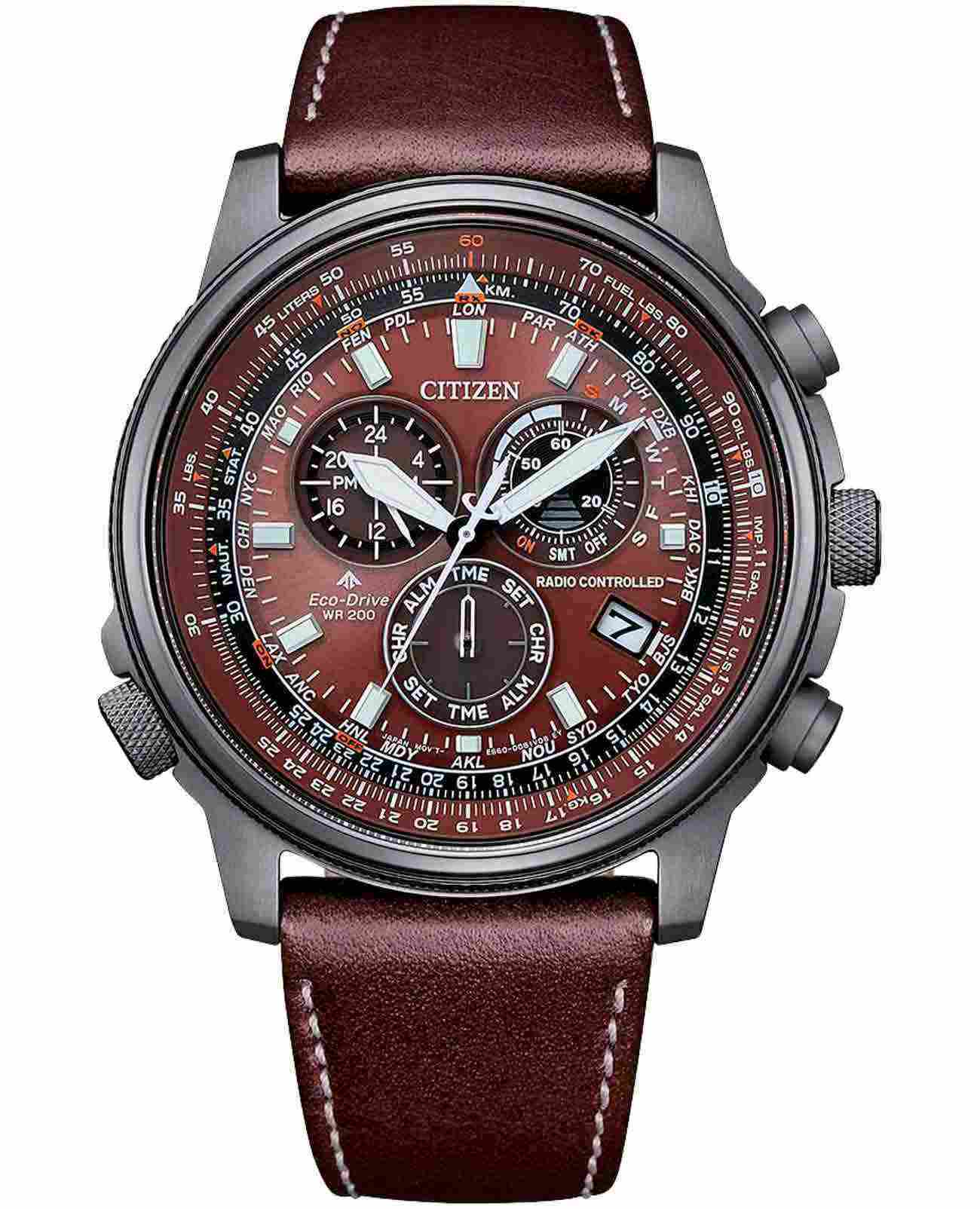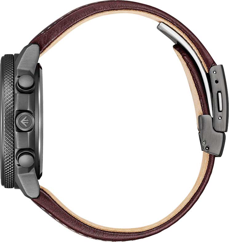 Citizen Promaster CB5868-09X часы-хронографХронографФункция позволяет измерять отрезки времени с особой точностью: часы, минуты, секунды. Верным признаком хронографа является наличие на циферблате 3 дополнительных окошек-счётчиков. с секундомеромСекундомерСекундоме́р — прибор, способный измерять интервалы времени с точностью до долей секунды. спортивного дизайна с высоким уровнем водозащиты. Корпус из нержавеющей стали с IP-покрытиемIP-покрытиеМетод ионного напыления. Демонстрирует повышенную устойчивость к истиранию, окислению и химическим веществам. Под воздействием высокого давления и температуры около 1500°C молекулы металла надёжно соединяются с частицами корпуса часов. диаметром 43,7 мм идеально сбалансирован. Сапфировое стеклоСапфировое стеклоПрочный и надёжный материал из кристалла сапфира синтетического происхождения, характеризующийся особой твёрдостью и устойчивостью к царапинам и повреждениям. с антибликовым покрытием обеспечивает отличную защиту циферблата от царапин. Часы работают на основе кварцевого механизма, питание от солнечной энергии. Кожаный ремешок на раскладной застёжкеРаскладная застёжкаТакой тип застёжки используется только на браслетах из металла. Она никогда не раскрывается полностью, происходит разделение на 2 и более частей. Раскладывающая застёжка снизит вероятность потери часов к минимуму. идеально дополняют дизайн часов, обеспечивая комфортное ношение. Стрелки и метки на циферблате имеют люминесцентное покрытиеЛюминесцентное покрытиеПозволяет считывать показания времени в темноте. Производители наносят на стрелки, часовые индексы, безель или поверхность циферблата светонакопительный состав, дающий холодное свечение. позволяющее легко определять время даже в темноте. Функция индикации заряда (EOL) и предотвращения перезарядки. Автоматический прием сигналов от радиовышек, расположенных в различных точках земного шара, которые передают временные сигналы от определенных атомных часов. Коррекция текущего времени радиосигналом на территории почти всей Европы, США, Японии и Китая. Мировое времяМировое время Полезное часовое усложнение, отображающее время в основных городах и известных областях по всему миру, оно связано с часовыми поясами, удобно для путешественников и бизнесменов. - 24 города, переход на зимнее и летнее время. Окошко даты находится в положении 4 часа. Циферблат выполнен по технологии Sunray (солнечные лучи). Вращающийся внутренний безельБезельВнешний ободок, закрепляющий стекло. В спортивных часах так называется поворотное кольцо с делениями на циферблате, выполняет роль таймера – замеряет отрезки времени на шкале. Неподвижный безель – элемент декора. Однонаправленно вращающийся безель на дайверских часах позволяет фиксировать моменты погружения и выныривания на поверхность. с логарифмической линейкой. Секундомер с точностью 1сек и временем измерения 1ч. 12-ти и 24-х часовой формат. Часы обладают впечатляющей водонепроницаемостью до 200WR, что делает их идеальными для плавания, ныряния и погружений с аквалангом.