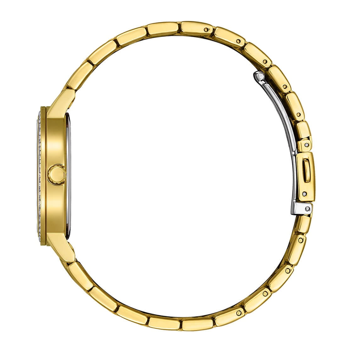Часы Citizen EL3102-50D представляют собой элегантную модель, выполненную в Японии, сочетающую в себе современные технологии и утончённый дизайн. Корпус и браслет изготовлены из прочной нержавеющей стали с золотистым IP-покрытиемIP-покрытиеМетод ионного напыления. Демонстрирует повышенную устойчивость к истиранию, окислению и химическим веществам. Под воздействием высокого давления и температуры около 1500°C молекулы металла надёжно соединяются с частицами корпуса часов., что обеспечивает долговечность и привлекательный внешний вид. Диаметр корпуса составляет 31 мм, а толщина — всего 7 мм, что делает часы изящными и аккуратными на запястье. Особое внимание привлекает безельБезельВнешний ободок, закрепляющий стекло. В спортивных часах так называется поворотное кольцо с делениями на циферблате, выполняет роль таймера – замеряет отрезки времени на шкале. Неподвижный безель – элемент декора. Однонаправленно вращающийся безель на дайверских часах позволяет фиксировать моменты погружения и выныривания на поверхность., украшенный мерцающими кристаллами, которые придают часам особый шарм и изысканность. Надёжный кварцевый механизм гарантирует точность хода, а водозащита уровня WR 50 позволяет не снимать часы при мытье рук или во время дождя. Перламутровый циферблат украшен часовыми индексами в виде точек и цифр, а также оснащён центральными стрелками часов, минут и секунд для удобного считывания времени и кристаллами. Минеральное стеклоМинеральное стеклоМинеральное стекло представляет собой искусственно выращенный минерал кварца. Такое стекло отличается особой устойчивостью к повреждениям и царапинам. Уступает по некоторым качествам сапфировому стеклу. устойчиво к появлению мелких царапин, сохраняя прозрачность и презентабельный вид.  Стальной браслет с золотистым  IP-покрытиемIP-покрытиеМетод ионного напыления. Демонстрирует повышенную устойчивость к истиранию, окислению и химическим веществам. Под воздействием высокого давления и температуры около 1500°C молекулы металла надёжно соединяются с частицами корпуса часов. и раскладной застёжкойРаскладная застёжкаТакой тип застёжки используется только на браслетах из металла. Она никогда не раскрывается полностью, происходит разделение на 2 и более частей. Раскладывающая застёжка снизит вероятность потери часов к минимуму. надежно фиксирует часы на запястье, обеспечивая комфорт при ежедневном ношении.