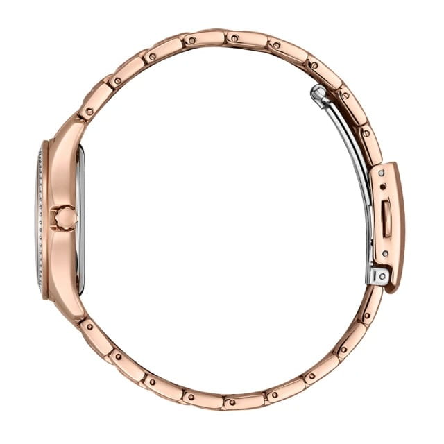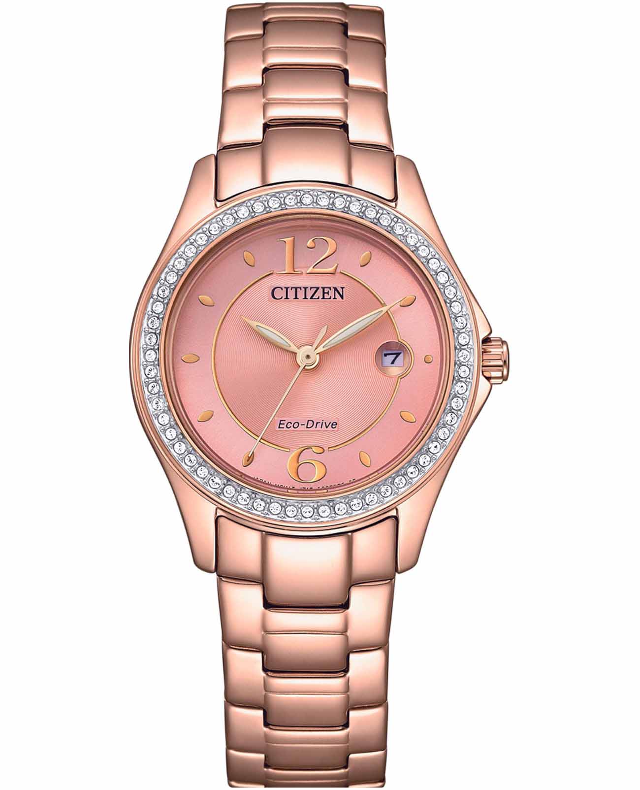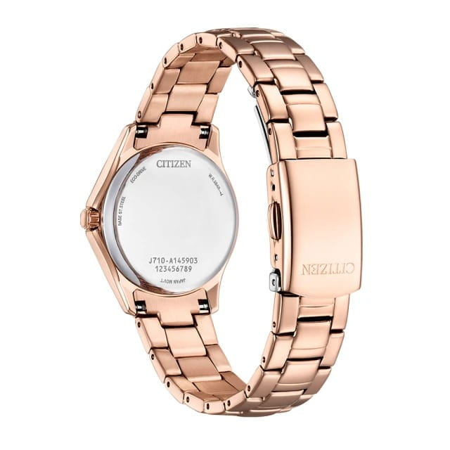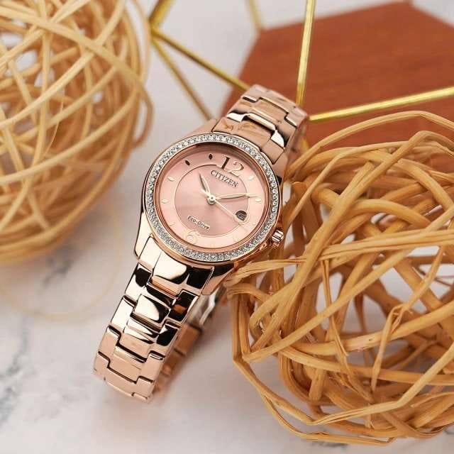 Изящные женские часы Citizen FE1252-82X сочетают в себе современную японскую точность и утончённый стиль. Кварцевый механизм обеспечивает надёжную работу и минимальное отклонение времени. Корпус диаметром 29,5 мм и толщиной 8,5 мм выполнен из нержавеющей стали с изысканным IP-покрытиемIP-покрытиеМетод ионного напыления. Демонстрирует повышенную устойчивость к истиранию, окислению и химическим веществам. Под воздействием высокого давления и температуры около 1500°C молекулы металла надёжно соединяются с частицами корпуса часов. розового золота, что придаёт изделию особый шарм. А безельБезельВнешний ободок, закрепляющий стекло. В спортивных часах так называется поворотное кольцо с делениями на циферблате, выполняет роль таймера – замеряет отрезки времени на шкале. Неподвижный безель – элемент декора. Однонаправленно вращающийся безель на дайверских часах позволяет фиксировать моменты погружения и выныривания на поверхность. часов покрыт кристаллами, что придаёт аксессуару изящный и утончённый вид. Розовый циферблат украшен 60 сверкающими кристаллами, создавая эффектное мерцание при каждом движении. Центральные стрелки отображают часы, минуты и секунды, а окошко даты расположено на отметке «3 часа» для удобства отслеживания текущей даты. Стрелки с люминесцентным покрытиемЛюминесцентное покрытиеПозволяет считывать показания времени в темноте. Производители наносят на стрелки, часовые индексы, безель или поверхность циферблата светонакопительный состав, дающий холодное свечение. обеспечивают отличную читаемость времени даже в темное время суток. Часы оснащены прочным минеральным стекломМинеральное стеклоМинеральное стекло представляет собой искусственно выращенный минерал кварца. Такое стекло отличается особой устойчивостью к повреждениям и царапинам. Уступает по некоторым качествам сапфировому стеклу., защищающим от случайных царапин, и водозащитой уровня WR50, что позволяет не беспокоиться о брызгах и дожде. Стальной браслет с раскладной застёжкойРаскладная застёжкаТакой тип застёжки используется только на браслетах из металла. Она никогда не раскрывается полностью, происходит разделение на 2 и более частей. Раскладывающая застёжка снизит вероятность потери часов к минимуму. на кнопке обеспечивает надёжную фиксацию и комфортную посадку на запястье.