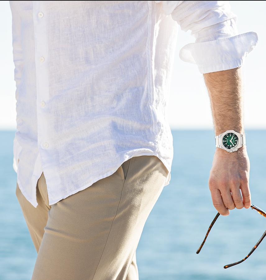 Citizen SERIES 8 NB6060-58X мужские часы спортивного дизайна с высоким уровнем водозащиты. Корпус из нержавеющей стали диаметром 42.6 мм идеально сбалансирован. Сапфировое стеклоСапфировое стеклоПрочный и надёжный материал из кристалла сапфира синтетического происхождения, характеризующийся особой твёрдостью и устойчивостью к царапинам и повреждениям. с антибликовым покрытием обеспечивает отличную защиту циферблата от царапин. Механические часы с автоподзаводом. Стальной браслет на раскладной застёжкеРаскладная застёжкаТакой тип застёжки используется только на браслетах из металла. Она никогда не раскрывается полностью, происходит разделение на 2 и более частей. Раскладывающая застёжка снизит вероятность потери часов к минимуму. идеально дополняют дизайн часов, обеспечивая комфортное ношение. Стрелки и метки на циферблате имеют люминесцентное покрытиеЛюминесцентное покрытиеПозволяет считывать показания времени в темноте. Производители наносят на стрелки, часовые индексы, безель или поверхность циферблата светонакопительный состав, дающий холодное свечение. позволяющее легко определять время даже в темноте. Окошко даты находится в положении 3 часа. Магнитоустойчивость 16000 а/м. Запас хода около 42 часов. Циферблат тёмно-зелёного цвета с текстурой, вдохновлённой ночным небом Токио, наложенной на традиционный японский узор «чекерборд», символизирующий процветание. Часы обладают впечатляющей водонепроницаемостью до 200WR, что делает их идеальными для плавания. Прозрачная задняя крышка.