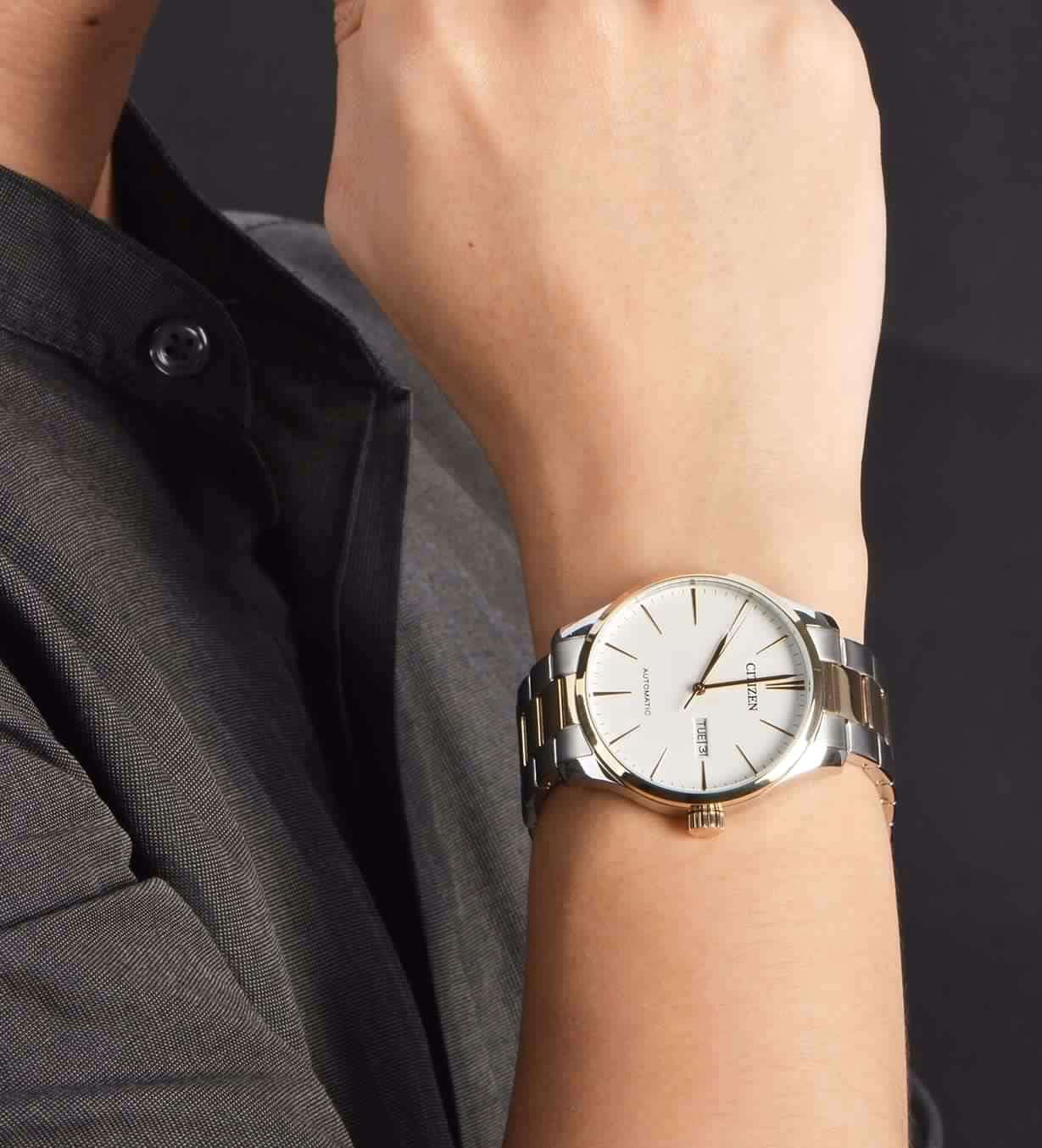 Мужские часы Citizen Tsuyosa NH8356-87A - идеальное сочетание классического и современного дизайна. Корпус из нержавеющей стали диаметром 40 мм идеально сбалансирован. Минеральное стеклоМинеральное стеклоМинеральное стекло представляет собой искусственно выращенный минерал кварца. Такое стекло отличается особой устойчивостью к повреждениям и царапинам. Уступает по некоторым качествам сапфировому стеклу. обеспечивает отличную защиту циферблата от царапин. Механические часы с автоподзаводом. Стальной браслет на раскладной застёжкеРаскладная застёжкаТакой тип застёжки используется только на браслетах из металла. Она никогда не раскрывается полностью, происходит разделение на 2 и более частей. Раскладывающая застёжка снизит вероятность потери часов к минимуму. с частичным IP-покрытиемIP-покрытиеМетод ионного напыления. Демонстрирует повышенную устойчивость к истиранию, окислению и химическим веществам. Под воздействием высокого давления и температуры около 1500°C молекулы металла надёжно соединяются с частицами корпуса часов. идеально дополняют дизайн часов, обеспечивая комфортное ношение. БезельБезельВнешний ободок, закрепляющий стекло. В спортивных часах так называется поворотное кольцо с делениями на циферблате, выполняет роль таймера – замеряет отрезки времени на шкале. Неподвижный безель – элемент декора. Однонаправленно вращающийся безель на дайверских часах позволяет фиксировать моменты погружения и выныривания на поверхность. с IP-покрытиемIP-покрытиеМетод ионного напыления. Демонстрирует повышенную устойчивость к истиранию, окислению и химическим веществам. Под воздействием высокого давления и температуры около 1500°C молекулы металла надёжно соединяются с частицами корпуса часов.. Метки в виде штрихов. Двойное окошко даты и дня недели находится в положении 3 часа. В механизме 21 камень, частота 21600 полуколебаний в час. Запас хода 40 часов. Часы обладают водонепроницаемостью до 50WR, что делает их идеальными для повседневной носки.