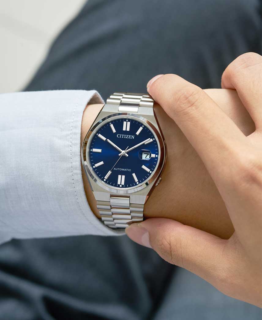Мужские часы Citizen Tsuyosa NJ0150-81L - идеальное сочетание классического и современного дизайна. Корпус из нержавеющей стали диаметром 40 мм идеально сбалансирован. Сапфировое стеклоСапфировое стеклоПрочный и надёжный материал из кристалла сапфира синтетического происхождения, характеризующийся особой твёрдостью и устойчивостью к царапинам и повреждениям. обеспечивает отличную защиту циферблата от царапин. Механические часы с автоподзаводом. Стальной браслет на раскладной застёжкеРаскладная застёжкаТакой тип застёжки используется только на браслетах из металла. Она никогда не раскрывается полностью, происходит разделение на 2 и более частей. Раскладывающая застёжка снизит вероятность потери часов к минимуму. идеально дополняют дизайн часов, обеспечивая комфортное ношение. Метки в виде штрихов. Окошко даты в положении 3 часа. Стрелки и метки с люминесцентным покрытиемЛюминесцентное покрытиеПозволяет считывать показания времени в темноте. Производители наносят на стрелки, часовые индексы, безель или поверхность циферблата светонакопительный состав, дающий холодное свечение.. В механизме 21 камень, частота 21600 полуколебаний в час. Запас хода 42 часа. Рифленая заводная головка находится в положении 4 часа. Завинчивающаяся прозрачная задняя крышка. Часы обладают водонепроницаемостью до 50WR, что делает их идеальными для повседневной носки.