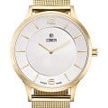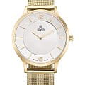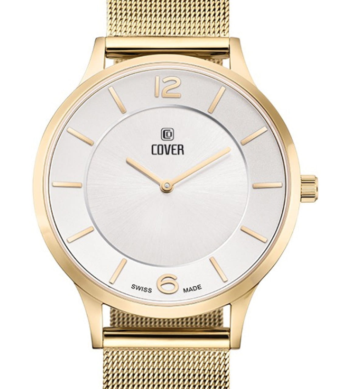 Женские наручные часы Cover CO2037.08 из коллекции Essential сочетают в себе классический дизайн и высокую точность швейцарского производства. Модель обладает круглым корпусом диаметром 38 мм, изготовленным из нержавеющей стали с PVD-покрытиемPVDУльтратонкое покрытие наносится в технике вакуумного напыления, сочетает в себе нитрид титана особой прочности со слоем золота или оксида хрома. Несёт в себе декоративную или защитную функцию., что придает изделию благородный внешний вид.  Для защиты используется сапфировое стеклоСапфировое стеклоПрочный и надёжный материал из кристалла сапфира синтетического происхождения, характеризующийся особой твёрдостью и устойчивостью к царапинам и повреждениям. с антибликовым покрытиемАнтибликовое покрытиеСлой оксида металла в 0,13-0,3 микрон, благодаря которому стекло часов не бликует и не отражает свет. Антибликовое покрытие уменьшает отражение света в 10 раз, обеспечивая отличную читаемость показателей циферблата., обеспечивающее прочную защиту от царапин и превосходную читаемость времени даже при ярком свете. Часы работают на высокоточном кварцевом механизме, гарантирующем исключительную точность хода с погрешностью около 20 секунд в месяц. Браслет "миланского плетения" выполнен из нержавеющей стали с золотистым PVD-покрытиемPVDУльтратонкое покрытие наносится в технике вакуумного напыления, сочетает в себе нитрид титана особой прочности со слоем золота или оксида хрома. Несёт в себе декоративную или защитную функцию. и оснащен раскладным замком, который легко можно подогнать по руке. Водонепроницаемость достигает 5 атмосфер (50 метров), что позволяет использовать их во время дождя и мытья рук, но не рекомендуется для плавания. Эти швейцарские часы станут идеальным дополнением как классического, так и современного образа.