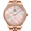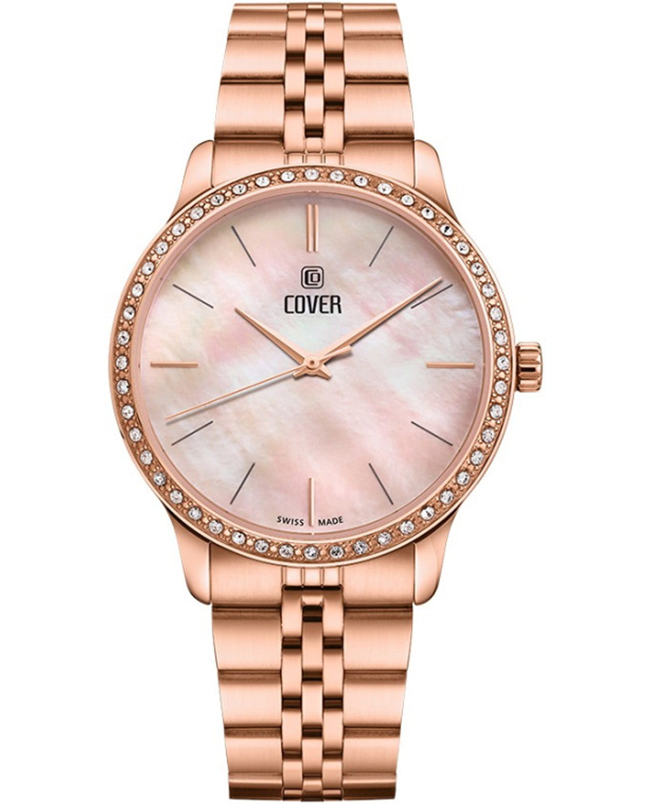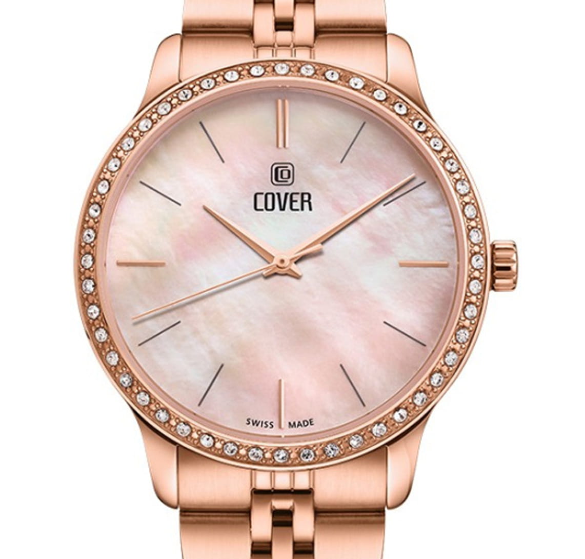 Женские наручные часы Cover Saraya CO206.05 сочетают в себе элегантный дизайн и надежность современных технологий. Модель обладает круглым корпусом диаметром 36 мм, изготовленным из нержавеющей стали с PVD-покрытиемPVDУльтратонкое покрытие наносится в технике вакуумного напыления, сочетает в себе нитрид титана особой прочности со слоем золота или оксида хрома. Несёт в себе декоративную или защитную функцию. цвета розового золота, что обеспечивает высокую устойчивость к внешним воздействиям.  Безель из стали с PVD-покрытиемPVDУльтратонкое покрытие наносится в технике вакуумного напыления, сочетает в себе нитрид титана особой прочности со слоем золота или оксида хрома. Несёт в себе декоративную или защитную функцию. декорирован кристаллами Swarowsky, которые придают часам особый шик и неповторимый вид. Для защиты используется сапфировое стеклоСапфировое стеклоПрочный и надёжный материал из кристалла сапфира синтетического происхождения, характеризующийся особой твёрдостью и устойчивостью к царапинам и повреждениям., обеспечивающее прочную защиту от царапин. Браслет выполнен из нержавеющей стали на раскладной застёжкеРаскладная застёжкаТакой тип застёжки используется только на браслетах из металла. Она никогда не раскрывается полностью, происходит разделение на 2 и более частей. Раскладывающая застёжка снизит вероятность потери часов к минимуму., которая отличается удобством использования. Часы работают на кварцевом механизме, основанном на ETA 902.002, что гарантирует точное время без необходимости подзаводки. Водонепроницаемость часов составляет 5 атмосфер, что позволяет использовать их в повседневной жизни, однако не рекомендуется для плавания или водных видов спорта.
