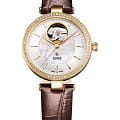 Часы COVER COA9.05 из коллекции Concerta Open Heart – элегантная модель швейцарского производства. Корпус выполнен из нержавеющей стали золотого цвета. Центральная область циферблата – белый перламутр, периферийная – круговое гильоше. Тонкий безельБезельВнешний ободок, закрепляющий стекло. В спортивных часах так называется поворотное кольцо с делениями на циферблате, выполняет роль таймера – замеряет отрезки времени на шкале. Неподвижный безель – элемент декора. Однонаправленно вращающийся безель на дайверских часах позволяет фиксировать моменты погружения и выныривания на поверхность. с покрытием PVDPVDУльтратонкое покрытие наносится в технике вакуумного напыления, сочетает в себе нитрид титана особой прочности со слоем золота или оксида хрома. Несёт в себе декоративную или защитную функцию. инкрустирован кристаллами Swarovski подчеркивает изысканный стиль. Сапфировое стеклоСапфировое стеклоПрочный и надёжный материал из кристалла сапфира синтетического происхождения, характеризующийся особой твёрдостью и устойчивостью к царапинам и повреждениям. защищает поверхность от повреждений. Водозащита 100 метров делает часы практичными для повседневного использования. Диаметр корпуса – 35 мм. Коричневый кожаный ремешок с классической застежкой обеспечивает надежную фиксацию и удобство в носке.