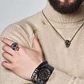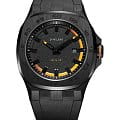 Мужские часы D1 Milano DTRJ03 из коллекции Delta 001 - воплощение современной мужественности. Часы с кварцевым механизмом  Miyota GM17 имеют стальной корпус с черным PVD-покрытиемPVDУльтратонкое покрытие наносится в технике вакуумного напыления, сочетает в себе нитрид титана особой прочности со слоем золота или оксида хрома. Несёт в себе декоративную или защитную функцию., диаметром 41,5 мм и толщиной 8,7 мм. Циферблат черно-оранжевый с пескоструйной обработкой, с метками в виде штрихов. Окошко даты в положении 3 часа. Циферблат покрыт сапфировым стекломСапфировое стеклоПрочный и надёжный материал из кристалла сапфира синтетического происхождения, характеризующийся особой твёрдостью и устойчивостью к царапинам и повреждениям. с антибликовым покрытием.  Водозащита часов - 50 метров (50WR) - позволит защитить корпус от случайных брызг или капель дождя. Задняя стальная крышка часов крепится на 4 винтах. Удобный каучуковый ремешок с классической застежкой завершает дизайн часов.