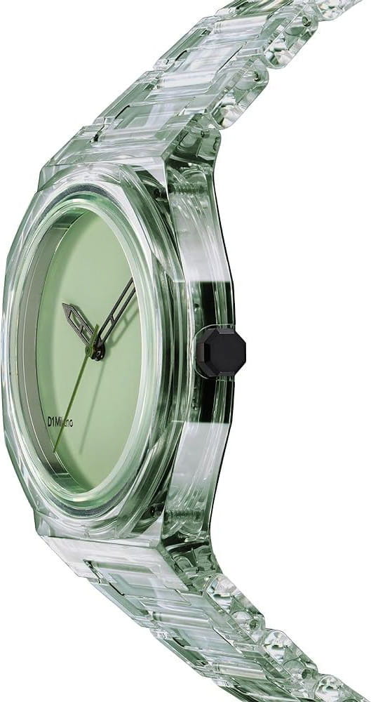 Часы D1 Milano Nylon Exp_Mint NYBJ04 – модный и стильный аксессуар-унисекс лаконичного дизайна. Часы работают на кварцевом механизме, обеспечивающем точность хода. Циферблат защищён минеральным стекломМинеральное стеклоМинеральное стекло представляет собой искусственно выращенный минерал кварца. Такое стекло отличается особой устойчивостью к повреждениям и царапинам. Уступает по некоторым качествам сапфировому стеклу. с антибликовым покрытиемАнтибликовое покрытиеСлой оксида металла в 0,13-0,3 микрон, благодаря которому стекло часов не бликует и не отражает свет. Антибликовое покрытие уменьшает отражение света в 10 раз, обеспечивая отличную читаемость показателей циферблата., устойчивым к царапинам, хорошо может выдержать небольшие удары и падения. Изысканный корпус выполнен из прозрачного зеленого нейлона. Зеленый матовый циферблат без индексов. Лаконичные стрелки-скелетон выполнены из латуни. Задняя крышка из стали с черным PVD-покрытиемPVDУльтратонкое покрытие наносится в технике вакуумного напыления, сочетает в себе нитрид титана особой прочности со слоем золота или оксида хрома. Несёт в себе декоративную или защитную функцию. закреплена на 4 винтах. Ремешок из нейлона имеет застёжку «бабочка» с кнопкамиЗастёжка "бабочка"Такой вид застёжки дополняется предохранителями, помогающими избежать случайного раскрытия браслета. Обладают изящным исполнением. . Водозащита 50 метров защищает часы от брызг и дождя, делая их подходящими для повседневного использования. Идеальный выбор для тех, кто ценит лаконичный стиль, точность и надёжность.