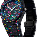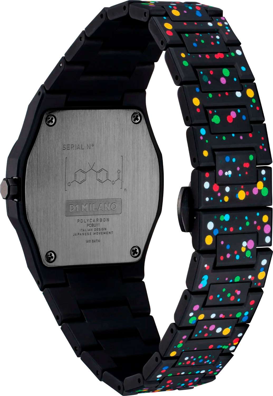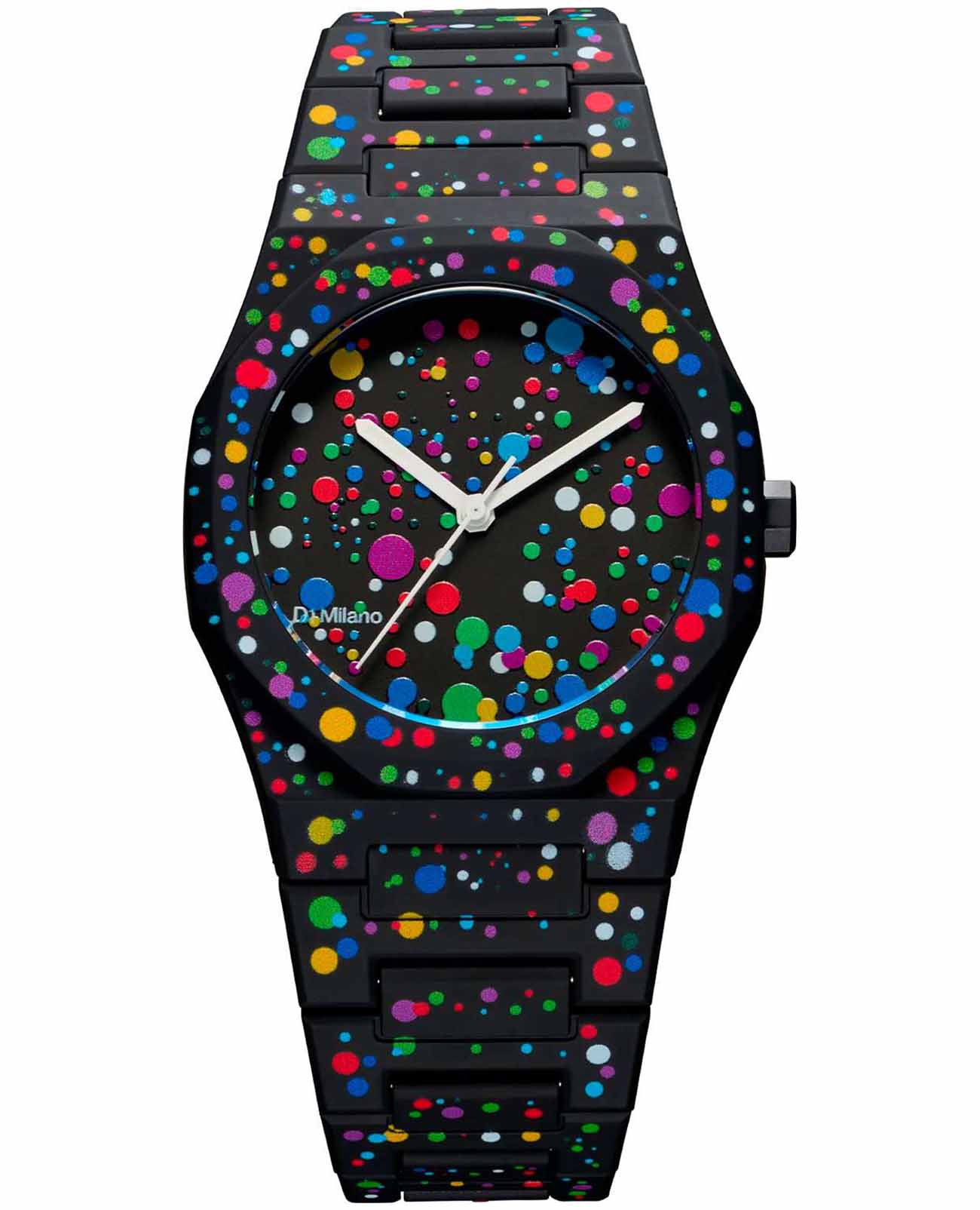 Часы D1 Milano Polycarbon PCBU11 – молодежные часы в стиле унисекс для повседневных образов, стильные и комфортные. Модель Poly Dot имеет черные с цветными брызгами корпус и браслет из поликарбоната с покрытием Софт-Тач. Циферблат лаконичный, защищен минеральным стекломМинеральное стеклоМинеральное стекло представляет собой искусственно выращенный минерал кварца. Такое стекло отличается особой устойчивостью к повреждениям и царапинам. Уступает по некоторым качествам сапфировому стеклу. с антибликовым покрытием. Стальная задняя крышка на 4 винтах. Пластиковый браслет на застёжке-бабочке с кнопкамиЗастёжка "бабочка"Такой вид застёжки дополняется предохранителями, помогающими избежать случайного раскрытия браслета. Обладают изящным исполнением. .