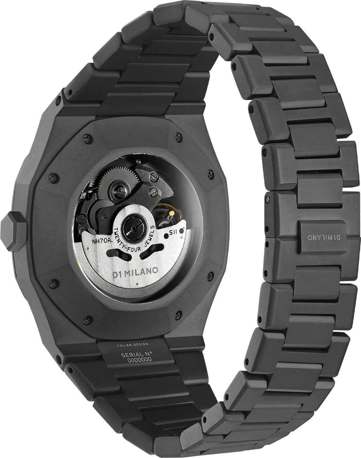 Часы D1 Milano SKBJ06 — это эффектные механические мужские часы, разработанные для ценителей уникальных аксессуаров. Их утонченный дизайн и высокое качество исполнения делают эти часы незаменимым элементом вашего стиля. Изготовленные в Италии, они оснащены надежным механизмом Seiko SII TMI NH70 с автоподзаводом, обеспечивающими запас хода до 41 часа. Частота работы механизма составляет 21600 полуколебаний в час. Часы имеют корпус из нержавеющей стали 316L с PVDPVDУльтратонкое покрытие наносится в технике вакуумного напыления, сочетает в себе нитрид титана особой прочности со слоем золота или оксида хрома. Несёт в себе декоративную или защитную функцию. покрытием, что гарантирует долговечность и стойкость к внешним воздействиям. Черный скелетонизированный циферблат защищен сапфировым стекломСапфировое стеклоПрочный и надёжный материал из кристалла сапфира синтетического происхождения, характеризующийся особой твёрдостью и устойчивостью к царапинам и повреждениям. с антибликовым покрытием, подчеркивающим элегантность и изысканность модели. Метки в виде штрихов и прозрачная задняя крышка, закрепленная на 8 винтах, придают часам особый шарм. Стальной браслет с PVDPVDУльтратонкое покрытие наносится в технике вакуумного напыления, сочетает в себе нитрид титана особой прочности со слоем золота или оксида хрома. Несёт в себе декоративную или защитную функцию. покрытием и раскладной застёжкойРаскладная застёжкаТакой тип застёжки используется только на браслетах из металла. Она никогда не раскрывается полностью, происходит разделение на 2 и более частей. Раскладывающая застёжка снизит вероятность потери часов к минимуму. обеспечивает комфортное и надежное ношение. Водозащита до 50 метров делает эти часы подходящими для повседневного использования.