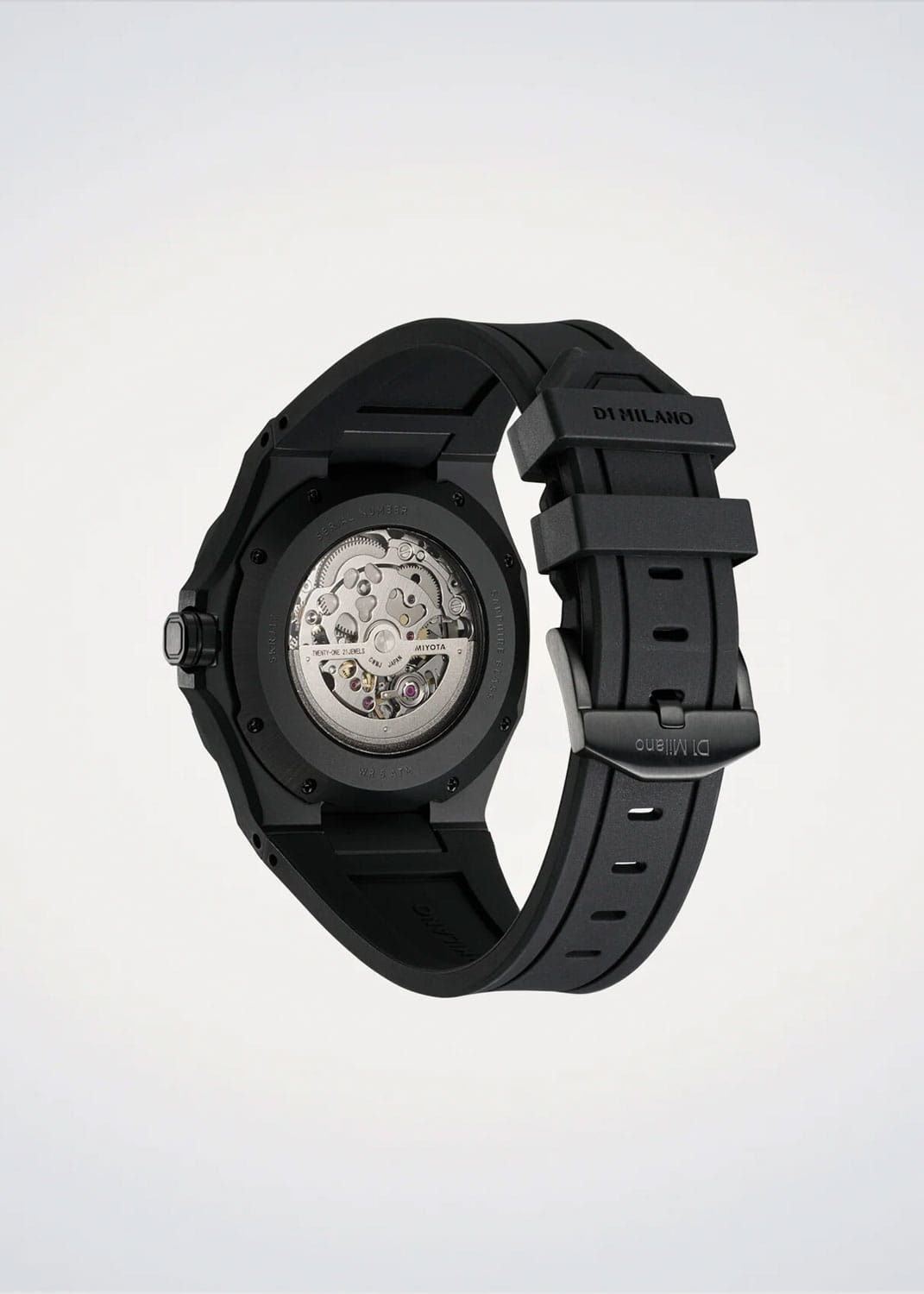 Часы D1 Milano Skeleton SKRJ17 — это эффектные механические мужские часы, разработанные для ценителей уникальных аксессуаров. Их утонченный дизайн и высокое качество исполнения делают эти часы незаменимым элементом вашего стиля. Изготовленные в Италии, они оснащены надежным механизмом Miyota 8N40 с автоподзаводом, обеспечивающими запас хода до 42 часа. Частота работы механизма составляет 21600 полуколебаний в час. Часы имеют корпус из нержавеющей стали с PVD-покрытиемPVDУльтратонкое покрытие наносится в технике вакуумного напыления, сочетает в себе нитрид титана особой прочности со слоем золота или оксида хрома. Несёт в себе декоративную или защитную функцию. черного цвета, что гарантирует долговечность и стойкость к внешним воздействиям. Скелетонизированный циферблат защищен сапфировым стекломСапфировое стеклоПрочный и надёжный материал из кристалла сапфира синтетического происхождения, характеризующийся особой твёрдостью и устойчивостью к царапинам и повреждениям. с антибликовым покрытиемАнтибликовое покрытиеСлой оксида металла в 0,13-0,3 микрон, благодаря которому стекло часов не бликует и не отражает свет. Антибликовое покрытие уменьшает отражение света в 10 раз, обеспечивая отличную читаемость показателей циферблата., подчеркивающим элегантность и изысканность модели и защищает от царапин. Стрелки с люминесцентным покрытиемЛюминесцентное покрытиеПозволяет считывать показания времени в темноте. Производители наносят на стрелки, часовые индексы, безель или поверхность циферблата светонакопительный состав, дающий холодное свечение.. Метки в виде штрихов и прозрачная задняя крышка, закрепленная на 8 винтах, придают часам особый шарм. Каучуковый ремешок с классической застежкой обеспечивает комфортное и надежное ношение. Водозащита до 50 WR делает эти часы подходящими для повседневного использования.