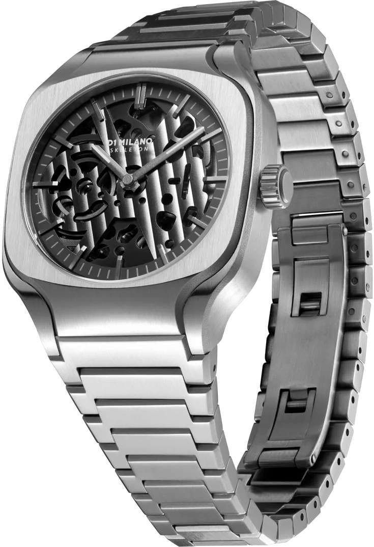 Часы D1 Milano SLBJ01 — это воплощение современной элегантности, вдохновленной классическими традициями. Эти механические часы с автоподзаводом впечатляют своим уникальным дизайном и высоким качеством исполнения. Квадратный корпус из стали 316L с размерами 37х37 мм и толщиной 11,3 мм дополнен прозрачной задней крышкой, закрепленной на 4 винтах, что позволяет любоваться скелетонизированным механизмом и частотой 21600 полуколебаний в час. Серый циферблат защищен сапфировым стекломСапфировое стеклоПрочный и надёжный материал из кристалла сапфира синтетического происхождения, характеризующийся особой твёрдостью и устойчивостью к царапинам и повреждениям. с антибликовым покрытием, а метки в виде штрихов добавляют дизайну лаконичности и изысканности. Часы оснащены браслетом из нержавеющей стали с раскладной застёжкойРаскладная застёжкаТакой тип застёжки используется только на браслетах из металла. Она никогда не раскрывается полностью, происходит разделение на 2 и более частей. Раскладывающая застёжка снизит вероятность потери часов к минимуму., обеспечивая надежность и комфорт при носке. Запас хода составляет 41 час, что делает их идеальным выбором для современных ценителей времени. Водозащита до 50WR гарантирует защиту от влаги в повседневных условиях. Эти итальянские часы представляют собой идеальное сочетание традиционного мастерства и инновационного подхода, воплощая в себе новый взгляд на классическую элегантность.