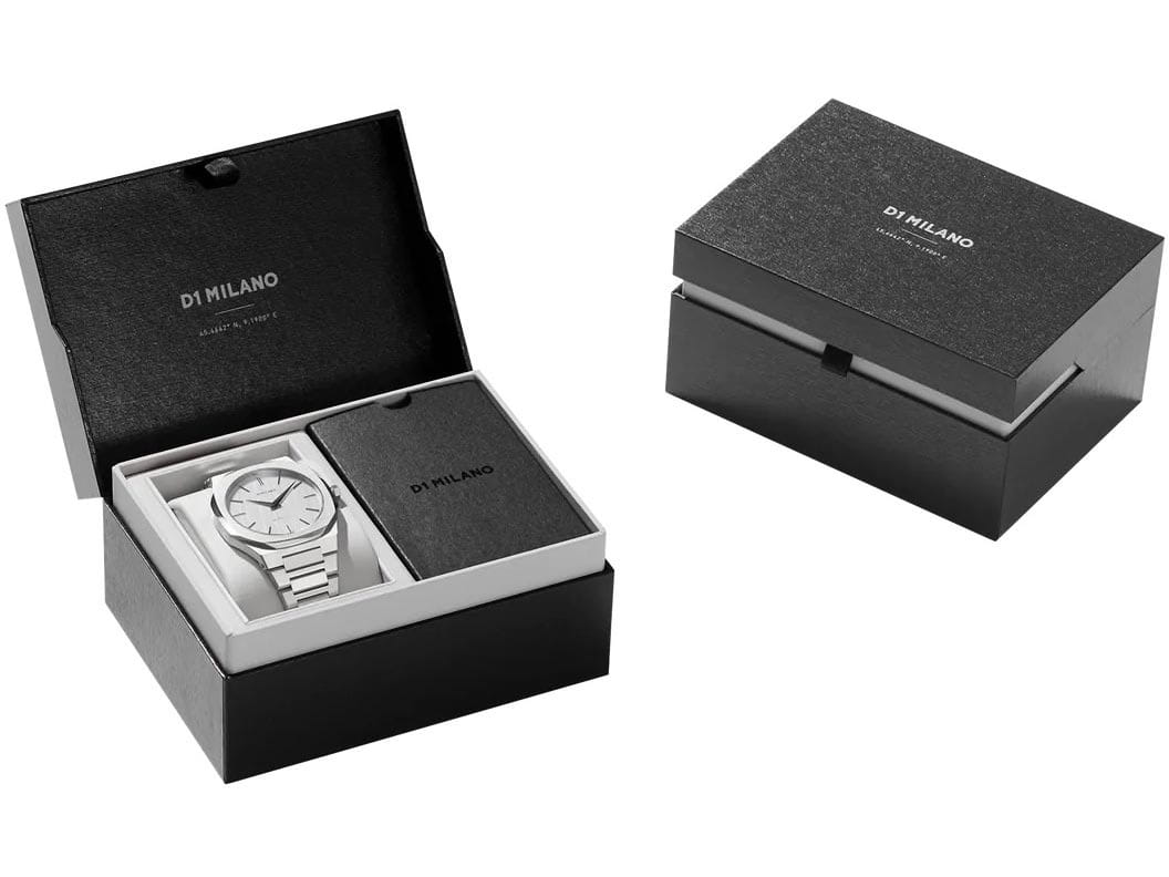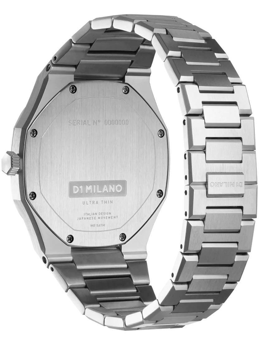 Часы D1 Milano UTBJ23 — это уникальные кварцевые часы, которые подчеркнут ваш изысканный стиль. Эти наручные часы из коллекции Ultra Thin с эффектным монохромным дизайном станут выразительным акцентом вашего образа. Корпус диаметром 40 мм из нержавеющей стали придает часам современный и утонченный вид. Серебристый циферблат метками в виде штрихов, а серебристые хроматические стрелки и индексы создают стильный контраст, подчёркивая элегантность модели. Задняя крышка из нержавеющей стали закреплена на 8-х винтах и дополнена индивидуальным серийным номером, что подчеркивает уникальность каждого экземпляра. Стальной браслет с раскладной застёжкойРаскладная застёжкаТакой тип застёжки используется только на браслетах из металла. Она никогда не раскрывается полностью, происходит разделение на 2 и более частей. Раскладывающая застёжка снизит вероятность потери часов к минимуму. обеспечивает надежность и комфорт в повседневном использовании. Сапфировое стеклоСапфировое стеклоПрочный и надёжный материал из кристалла сапфира синтетического происхождения, характеризующийся особой твёрдостью и устойчивостью к царапинам и повреждениям. с антибликовым покрытием защищает циферблат, а водозащита до 50WR делает эти часы практичным выбором для любых условий. Благодаря калибру Miyota 1L22, они отличаются точностью и надежностью. Эти итальянские часы представляют собой идеальное сочетание традиционного мастерства и инновационного подхода, воплощая в себе новый взгляд на классическую элегантность.