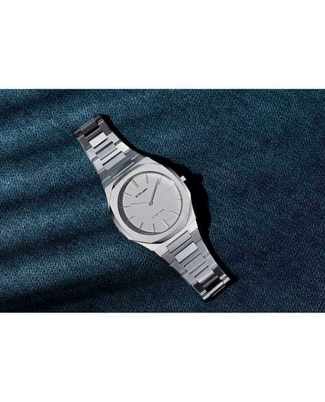 Женские наручные часы D1 Milano UTBL01 из коллекции Ultra Thin сочетают в себе классический дизайн и современные технологии. Модель обладает восьмиугольным корпусом диаметром 38 мм, изготовленным из нержавеющей стали 316L, что обеспечивает высокую устойчивость к внешним воздействиям. Браслет также выполнен из нержавеющей стали с раскладной застежкойРаскладной замокДанный вариант застежки используется только на часах с металлическим браслетом. Отличительная особенность такого крепления в том, что длина браслета становится универсальной и вы можете самостоятельно отрегулировать нужный вам размер – застежка просто двигается по браслету часов., гарантирующей комфортное ношение и безопасность. Белый циферблат украшен метками и оснащен стрелочным механизмом, который подчеркивает элегантность модели. Для защиты используется сапфировое стеклоСапфировое стеклоПрочный и надёжный материал из кристалла сапфира синтетического происхождения, характеризующийся особой твёрдостью и устойчивостью к царапинам и повреждениям. с антибликовым покрытиемАнтибликовое покрытиеСлой оксида металла в 0,13-0,3 микрон, благодаря которому стекло часов не бликует и не отражает свет. Антибликовое покрытие уменьшает отражение света в 10 раз, обеспечивая отличную читаемость показателей циферблата., обеспечивающее прочную защиту от царапин и бликов. Часы работают на кварцевом механизме, что гарантирует точность хода с погрешностью +/- 15 секунд в месяц, не требуя регулярного подзавода. Водонепроницаемость часов достигает 5 атмосфер (50 метров), что позволяет использовать их во время мытья рук или плавания, однако не рекомендуется для глубоководного дайвинга. Толщина ультратонкого корпуса составляет всего 6 мм, делая аксессуар легким и удобным для повседневного использования.