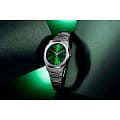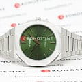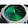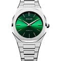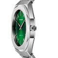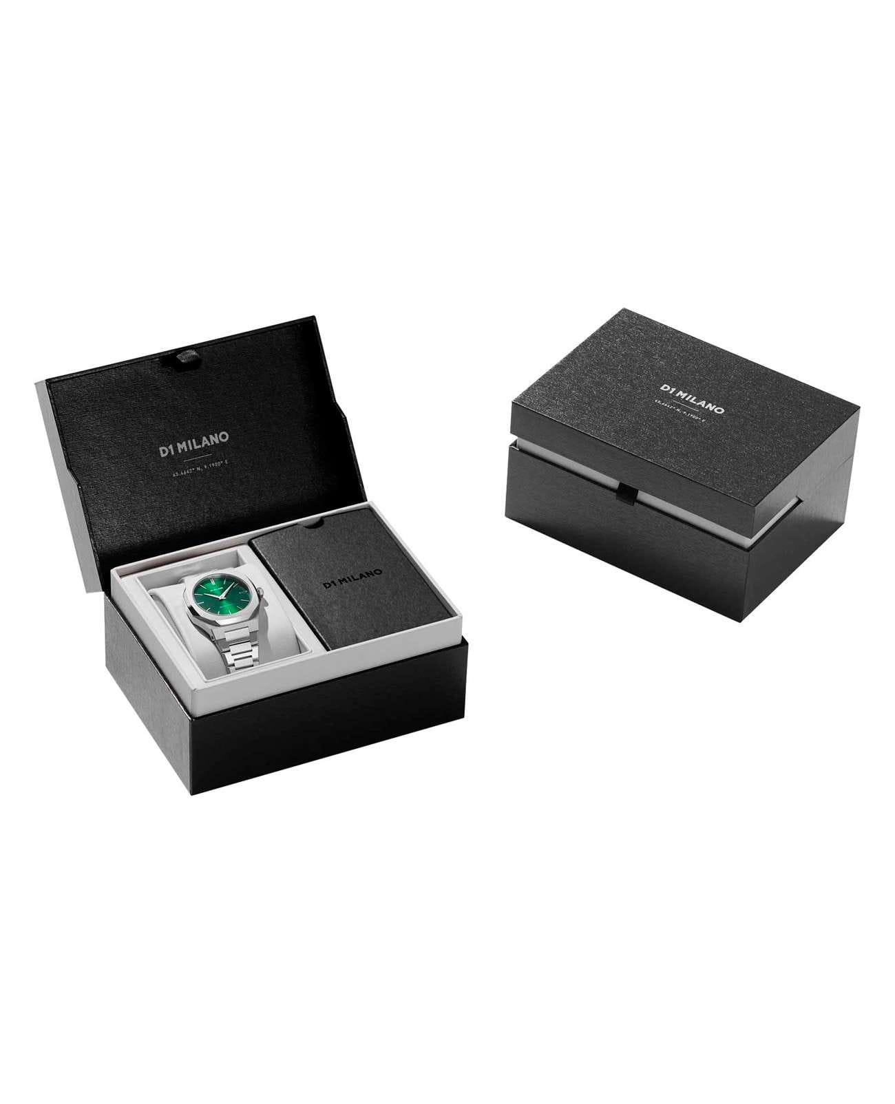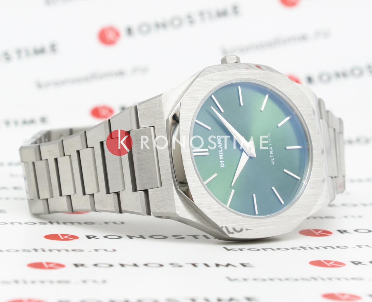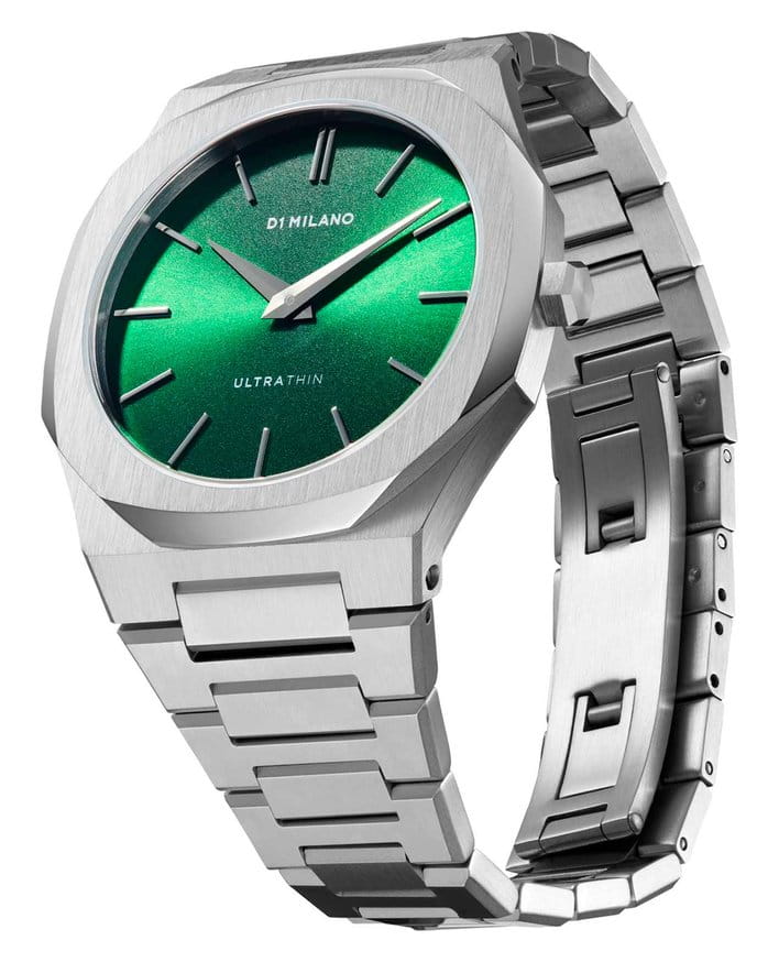 Женские наручные часы D1 Milano UTBL11 из коллекции Ultra Thin сочетают в себе элегантный дизайн и современные технологии. Модель обладает круглым корпусом диаметром 34 мм, изготовленным из высококачественной нержавеющей стали. Толщина ультратонкого корпуса составляет всего 6 мм, делая аксессуар легким и удобным для повседневного использования. Браслет также выполнен из нержавеющей стали с раскладной застежкойРаскладной замокДанный вариант застежки используется только на часах с металлическим браслетом. Отличительная особенность такого крепления в том, что длина браслета становится универсальной и вы можете самостоятельно отрегулировать нужный вам размер – застежка просто двигается по браслету часов., гарантирующей комфортное ношение и безопасность. Циферблат зеленого цвета украшен метками в виде штрихов и оснащен стрелочным механизмом, который подчеркивает элегантность модели. Для защиты используется сапфировое стеклоСапфировое стеклоПрочный и надёжный материал из кристалла сапфира синтетического происхождения, характеризующийся особой твёрдостью и устойчивостью к царапинам и повреждениям. с антибликовым покрытиемАнтибликовое покрытиеСлой оксида металла в 0,13-0,3 микрон, благодаря которому стекло часов не бликует и не отражает свет. Антибликовое покрытие уменьшает отражение света в 10 раз, обеспечивая отличную читаемость показателей циферблата., обеспечивающее прочную защиту от царапин и бликов. Часы работают на кварцевом механизме Miyota 1L22, гарантирующем точность хода без необходимости регулярного подзавода. Водонепроницаемость часов достигает 5 атмосфер (50 метров), что позволяет использовать их во время мытья рук или плавания, однако не рекомендуется для глубоководного дайвинга.
