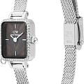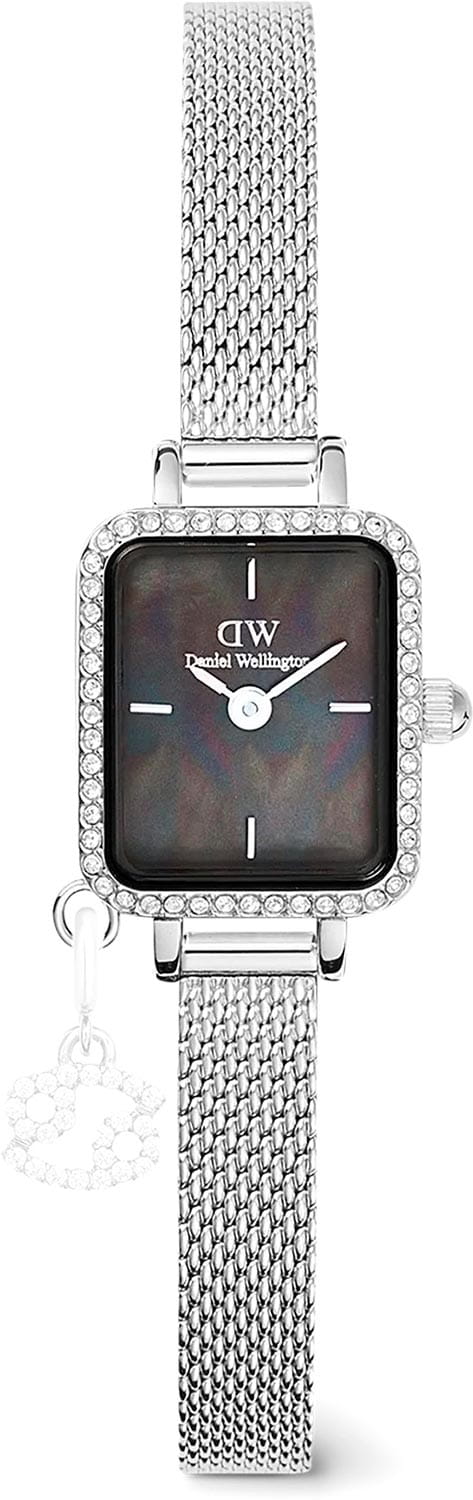 Женские наручные часы с минеральным стекломМинеральное стеклоМинеральное стекло представляет собой искусственно выращенный минерал кварца. Такое стекло отличается особой устойчивостью к повреждениям и царапинам. Уступает по некоторым качествам сапфировому стеклу. Daniel Wellington Quadro Mini Crystal Zodiac Sterling DW00100750, кварцевый механизм с высокой точностью. Миниатюрный корпус часов изготовлен из нержавеющей стали. БезельБезельВнешний ободок, закрепляющий стекло. В спортивных часах так называется поворотное кольцо с делениями на циферблате, выполняет роль таймера – замеряет отрезки времени на шкале. Неподвижный безель – элемент декора. Однонаправленно вращающийся безель на дайверских часах позволяет фиксировать моменты погружения и выныривания на поверхность. украшен кристаллами Swarovski. Матовый циферблат украшен фирменным логотипом Daniel Wellington. Накладные метки в виде штрихов. Японский кварцевый механизм. Рифленая заводная головка. Класс водозащиты: 30 метров, позволит защитить корпус от случайных брызг или капель дождя. Стальной браслет миланского плетения на раскладном замкеРаскладной замокДанный вариант застежки используется только на часах с металлическим браслетом. Отличительная особенность такого крепления в том, что длина браслета становится универсальной и вы можете самостоятельно отрегулировать нужный вам размер – застежка просто двигается по браслету часов.. Корпус дополнен колечком для подвески.