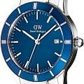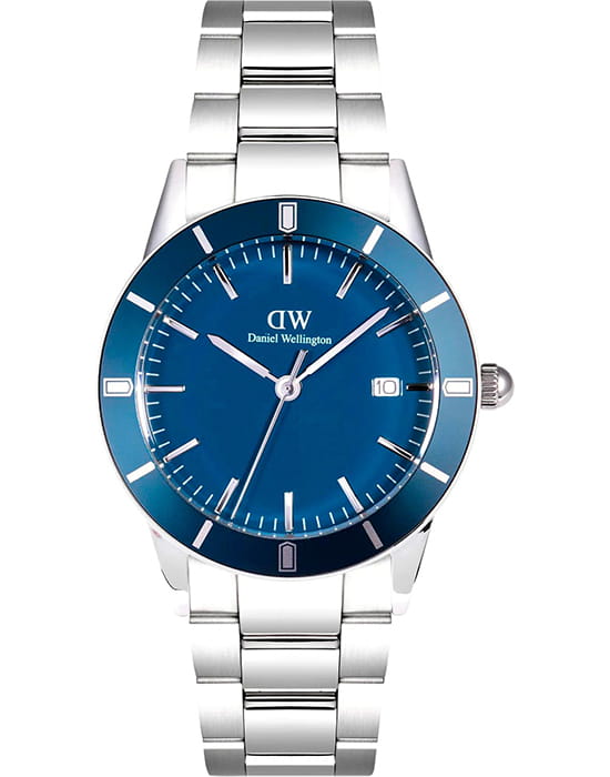 Daniel Wellington — мужские часы в современном спортивно-элегантном стиле. Круглый корпус диаметром 40 мм изготовлен из нержавеющей стали и дополнен синим безелемБезельВнешний ободок, закрепляющий стекло. В спортивных часах так называется поворотное кольцо с делениями на циферблате, выполняет роль таймера – замеряет отрезки времени на шкале. Неподвижный безель – элемент декора. Однонаправленно вращающийся безель на дайверских часах позволяет фиксировать моменты погружения и выныривания на поверхность. из анодированного алюминия, которое придаёт модели выразительный характер.