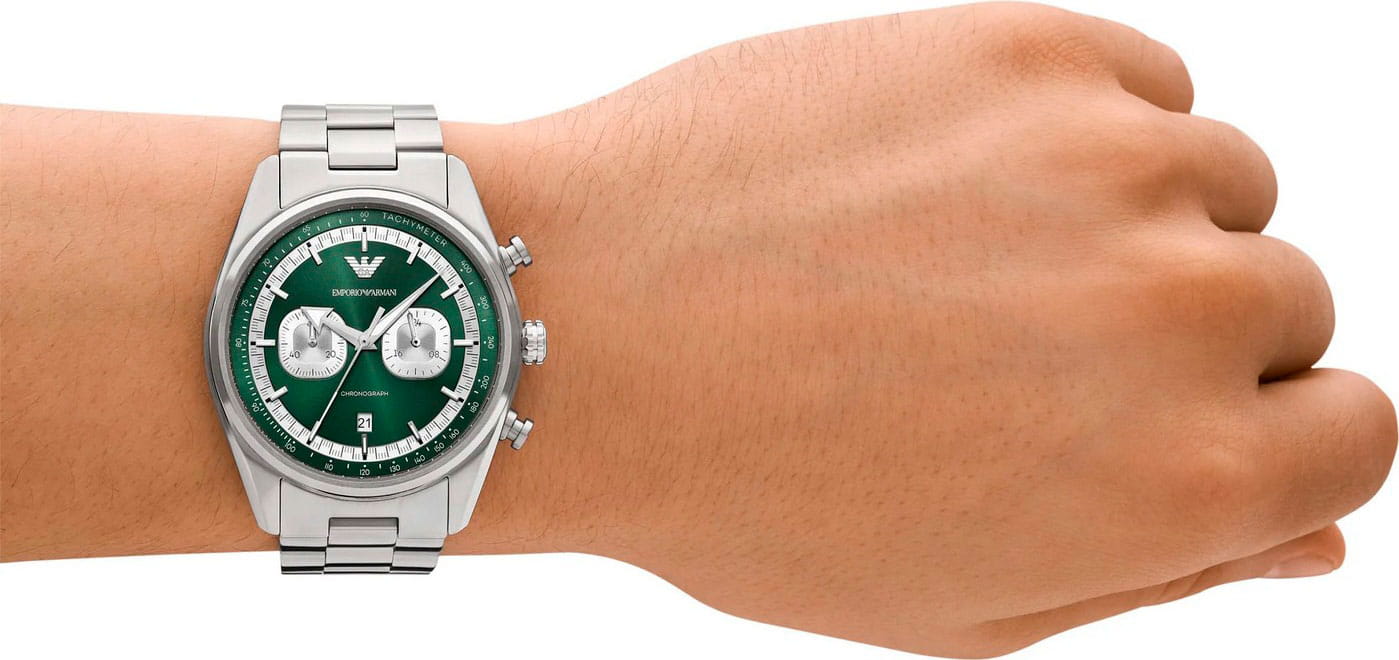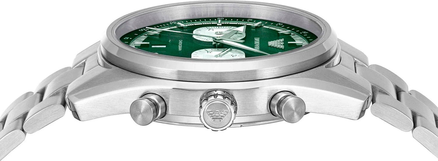 Мужские часы Emporio Armani Racer AR11637 - стильные кварцевые часы-хронографХронографФункция позволяет измерять отрезки времени с особой точностью: часы, минуты, секунды. Верным признаком хронографа является наличие на циферблате 3 дополнительных окошек-счётчиков. с секундомеромСекундомерСекундоме́р — прибор, способный измерять интервалы времени с точностью до долей секунды. сочетают в себе элегантность и функциональность, что делает их идеальным аксессуаром для современного мужчины. Корпус часов из нержавеющей стали, что обеспечивает долговечность и устойчивость к внешним воздействиям. Минеральное стеклоМинеральное стеклоМинеральное стекло представляет собой искусственно выращенный минерал кварца. Такое стекло отличается особой устойчивостью к повреждениям и царапинам. Уступает по некоторым качествам сапфировому стеклу. защищает циферблат, добавляя изысканности всей конструкции. Размер корпуса составляет 42 мм, а толщина — 11 мм, что придаёт часам солидный внешний вид, не утяжеляя при этом запястье. Часы имеют водонепроницаемость WR50 (5 атм), это позволяет использовать их в повседневной жизни, не опасаясь воздействия воды. Стальной браслет на застёжке-бабочке с кнопкамиЗастёжка "бабочка"Такой вид застёжки дополняется предохранителями, помогающими избежать случайного раскрытия браслета. Обладают изящным исполнением. обеспечивает комфортное и надёжное крепление на запястье. 12-ти и 24-х часовой формат времени добавляет практичности и удобства в использовании. ТахиметрТахиметрРазмеченная шкала, располагается на ободке или безеле часов. Тахиметр позволяет рассчитать скорость на определённом участке пути, расстояние измеряется в километрах или милях. по внешнему краю. Окошко даты находится в положении 6 часов. Стрелки с люминесцентным покрытиемЛюминесцентное покрытиеПозволяет считывать показания времени в темноте. Производители наносят на стрелки, часовые индексы, безель или поверхность циферблата светонакопительный состав, дающий холодное свечение. обеспечивают удобное считывание времени в темноте после кратковременного пребывания на свету, что делает эти часы практичными в любых условиях.