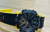 Наручные часы в чёрно-желтом исполнении реализуют технологию Carbon Core GuardCarbon Core Guard Новейшая структура корпуса, разработанная Casio. Полиуретановая пластина дополнительно усилена карбоновыми вставками, что придаёт специальную защиту от механических повреждений. Карбон отличается лёгкостью и прочностью., карбон послужил материалом для изготовления противоударного корпусаУдаропрочный корпусМеханизм заключён в корпус, выполненный из современных материалов, устойчивых к ударам, механическим повреждениям и падению с высоты: инновационный пластик, карбон, нержавеющая сталь, титан.. Это позволило добиться повышенной устойчивости к ударам и падению без утяжеления общей конструкции. БезельБезельВнешний ободок, закрепляющий стекло. В спортивных часах так называется поворотное кольцо с делениями на циферблате, выполняет роль таймера – замеряет отрезки времени на шкале. Неподвижный безель – элемент декора. Однонаправленно вращающийся безель на дайверских часах позволяет фиксировать моменты погружения и выныривания на поверхность. оставлен полимерным. Японский кварцевый механизм работает за счёт батарейки, срок службы которой - 3 года. Закаленное минеральное стекло. Двойная задняя крышка, стальная и пластиковая. Светодиодная подсветкаСветодиодная подсветкаСветодиодная или LED-подсветка обеспечивает появление яркого холодного свечения за счёт LED-элементов - маленьких лампочек. Они потребляют минимальное количество энергии, чаще всего можно встретить 1 светодиод, в нижней части циферблата.. Водонепроницаемость 200 метров. Возможность быстрой и лёгкой замены полимерного ремешка. ХронографХронографФункция позволяет измерять отрезки времени с особой точностью: часы, минуты, секунды. Верным признаком хронографа является наличие на циферблате 3 дополнительных окошек-счётчиков., автоматический календарь, мировое времяМировое время Полезное часовое усложнение, отображающее время в основных городах и известных областях по всему миру, оно связано с часовыми поясами, удобно для путешественников и бизнесменов. , будильник, секундомер, таймер с автоповтором. Габариты: 48,7 x 51,2 x 14,1 мм.